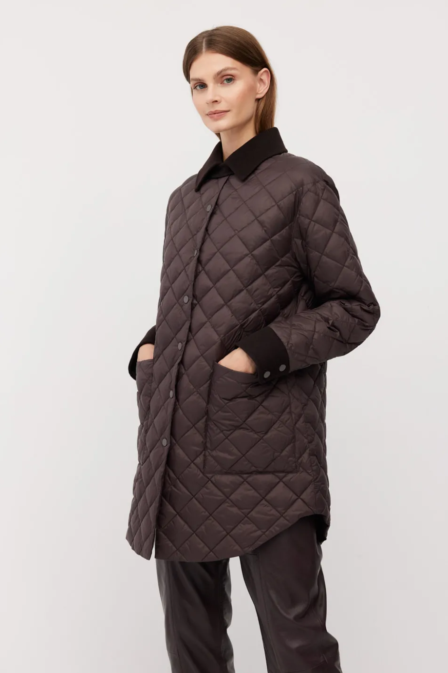 Gesteppte Jacke mit Druckknöpfen. Natürliche Füllung. Einfache und lockere Form. Aufgesetzte Taschen. Kragen und Manschetten aus Wolle. Farbe: Braun.