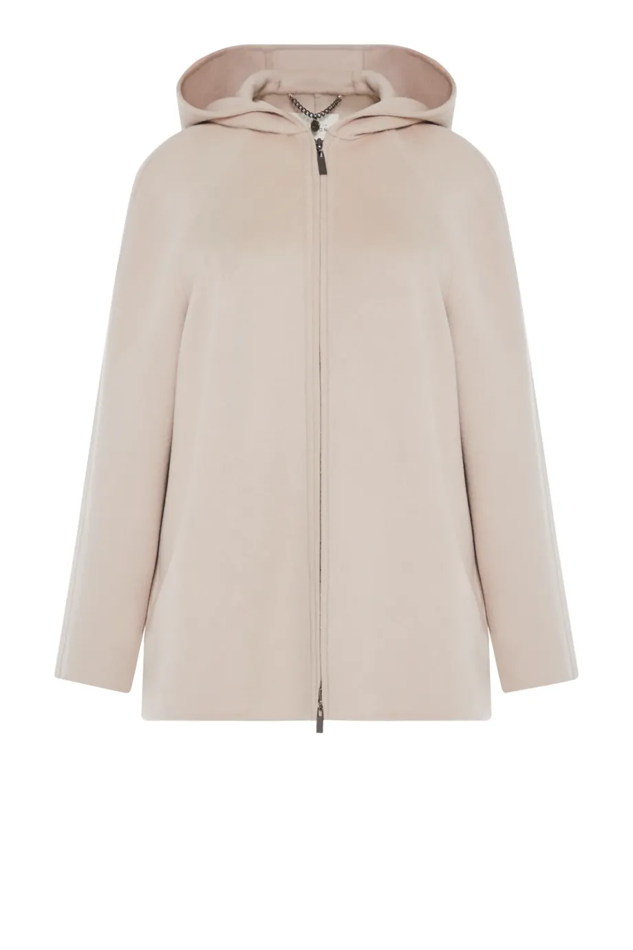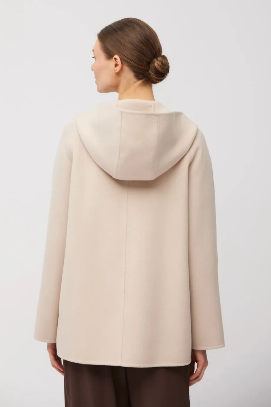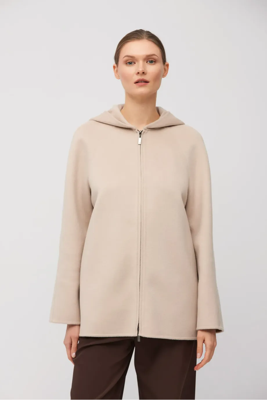 Leichte, ungefütterte Jacke mit einfacher, lockerer Form. Doubleface-Stoff – Mischung aus Wolle und Seide. Modell mit Kapuze und zweipoligem Metallreißverschluss. Farbe Beige.