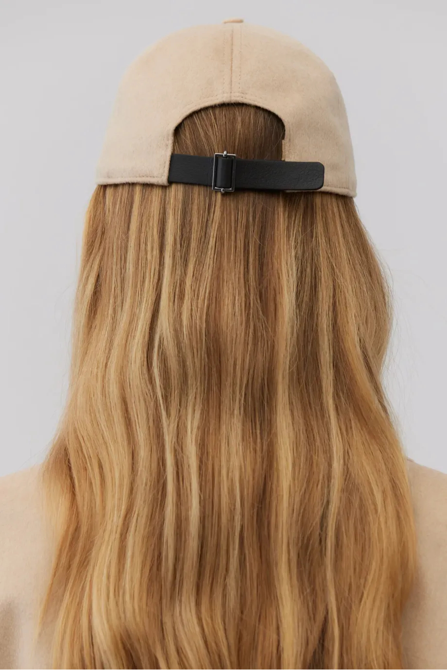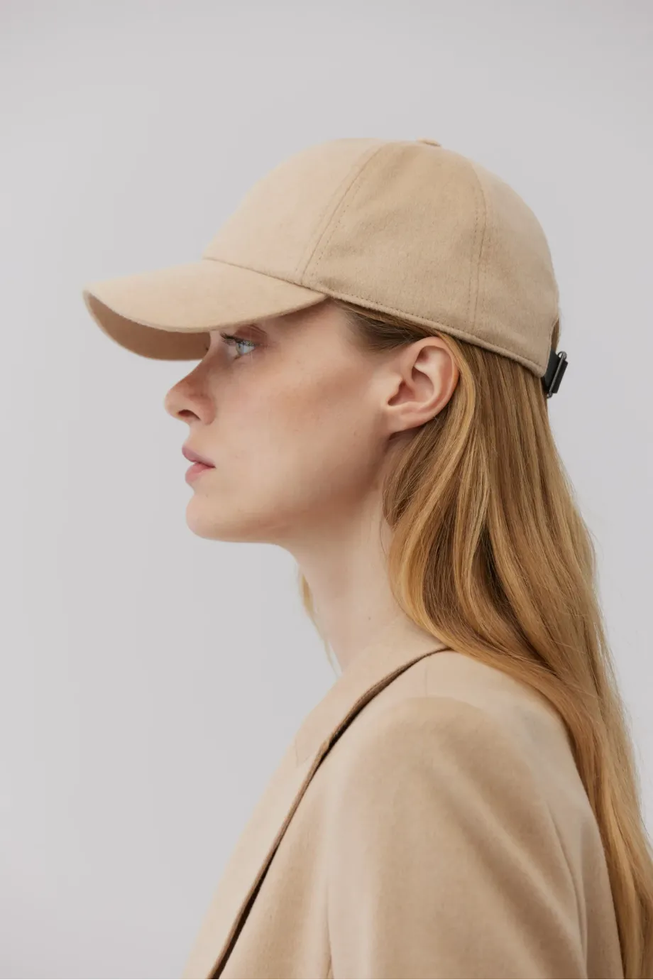Eine Baseballkappe aus Albino-Kamelwolle in natürlichem Beigeton. Besticktes Logo. Verstellbarer Verschluss aus echtem Leder auf der Rückseite.
