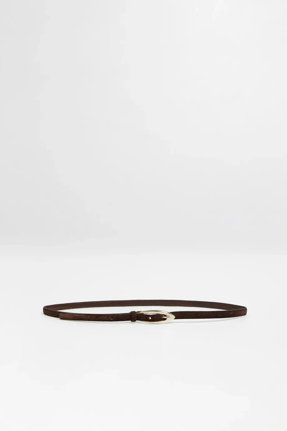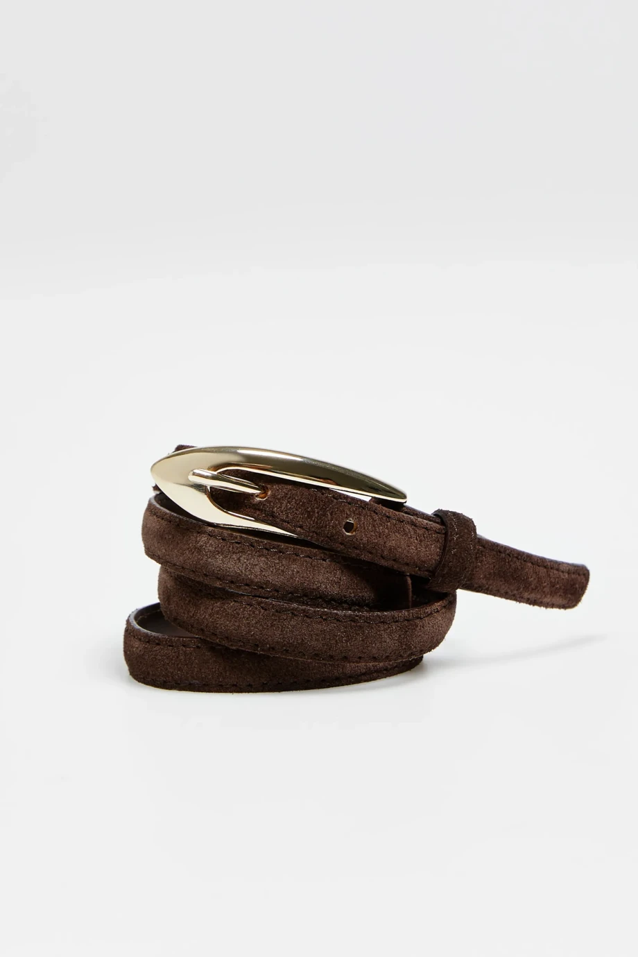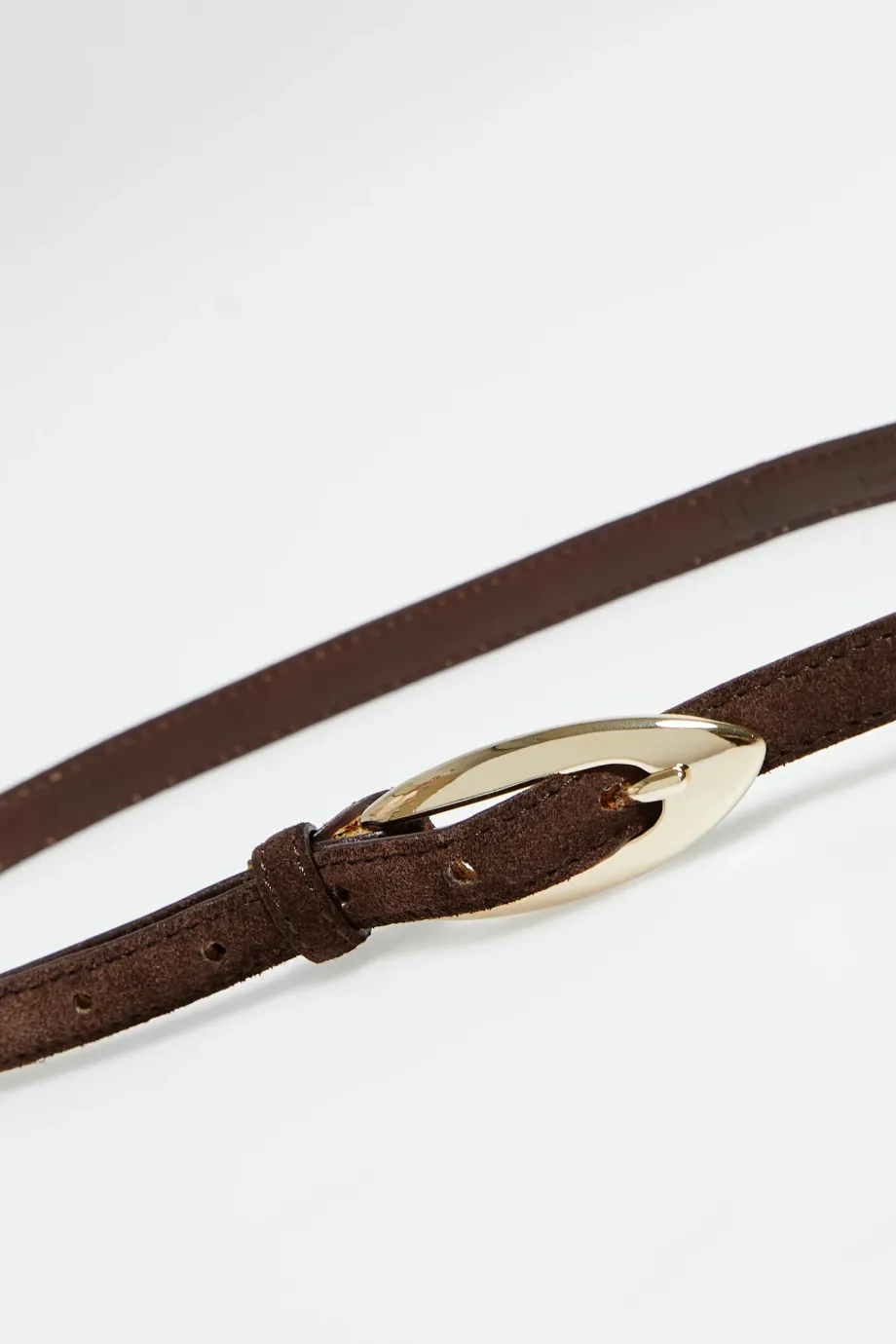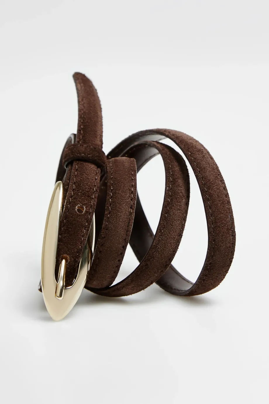 Brauner, dünner Gürtel aus natürlichem Veloursleder mit ovaler Schnalle in Goldfarbe. Handgefertigt in einer polnischen Manufaktur.