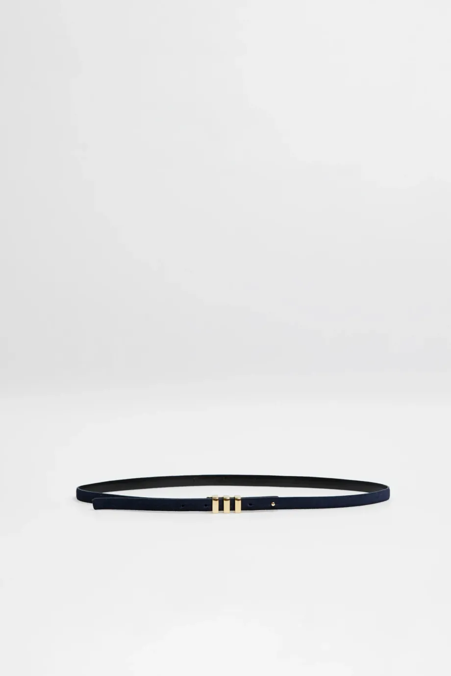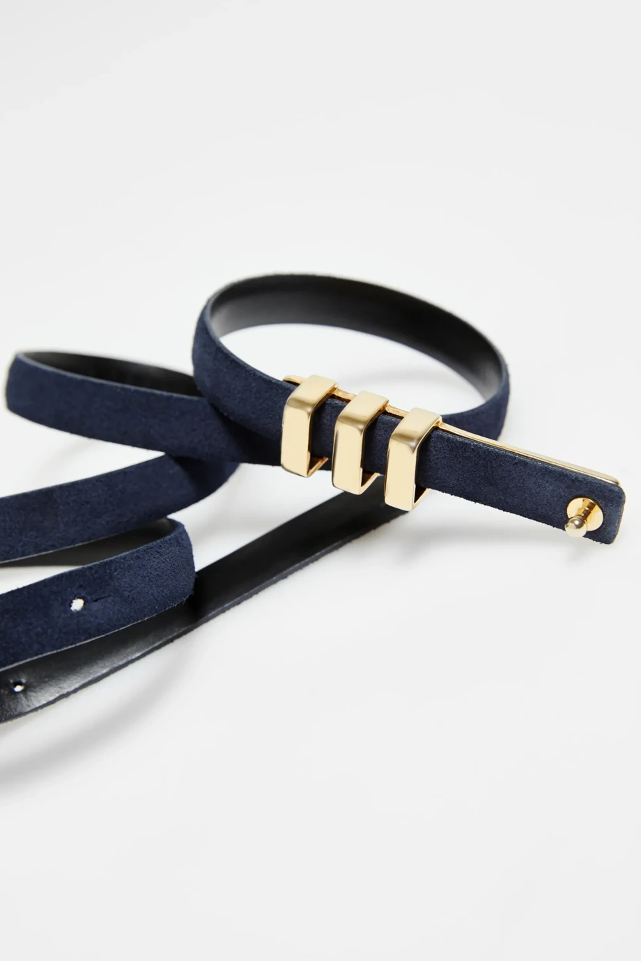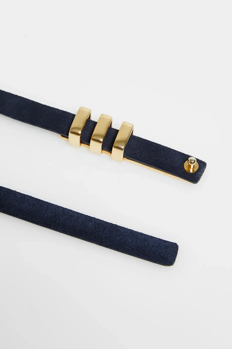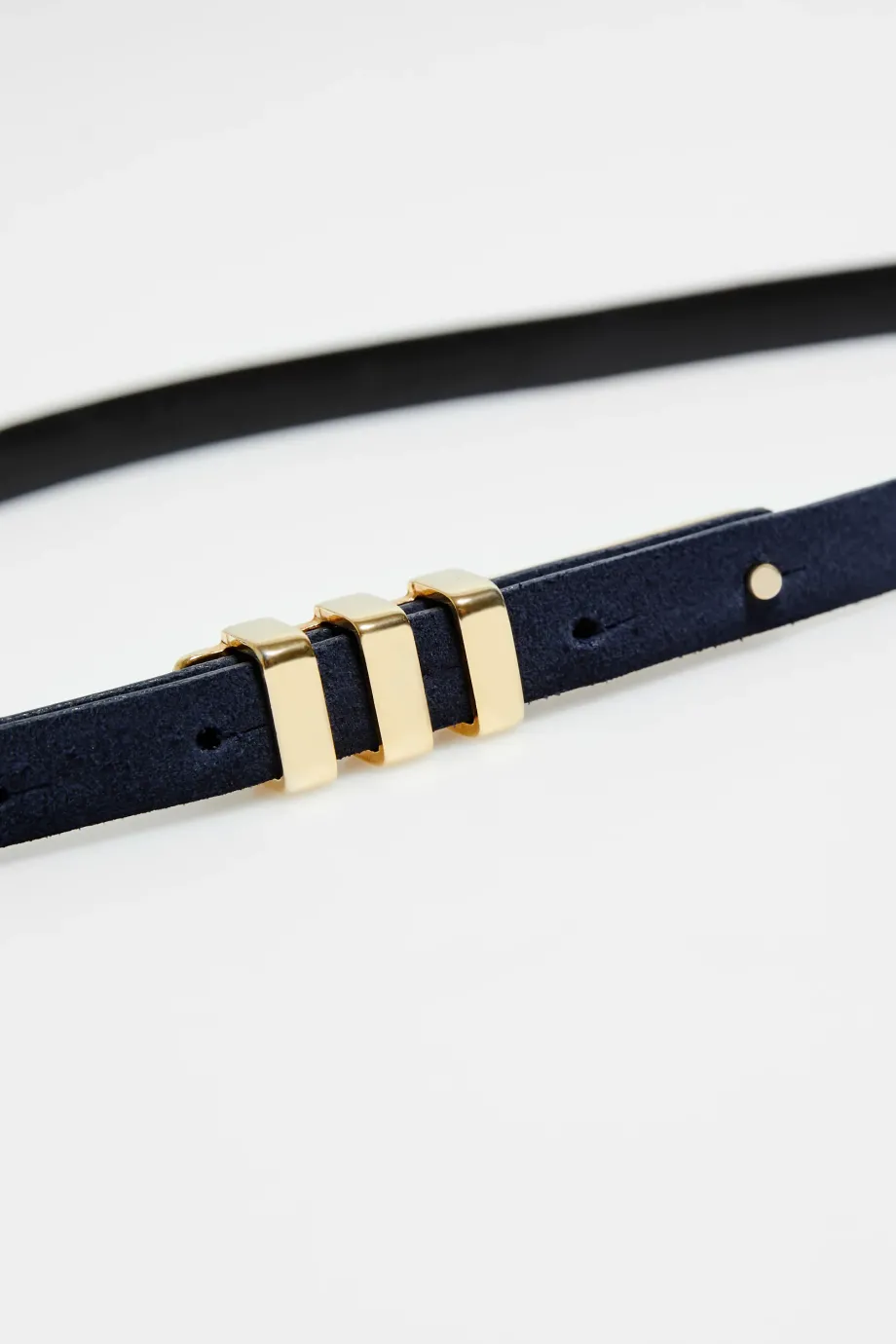 Dunkelblauer, dünner Gürtel aus natürlichem Veloursleder mit Schnalle in Goldfarbe. Handgefertigt in einer polnischen Manufaktur.