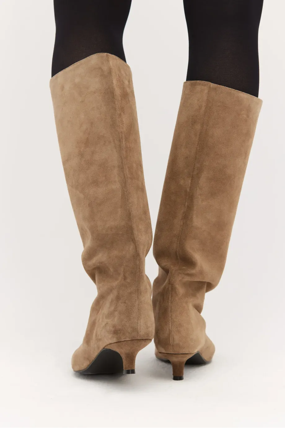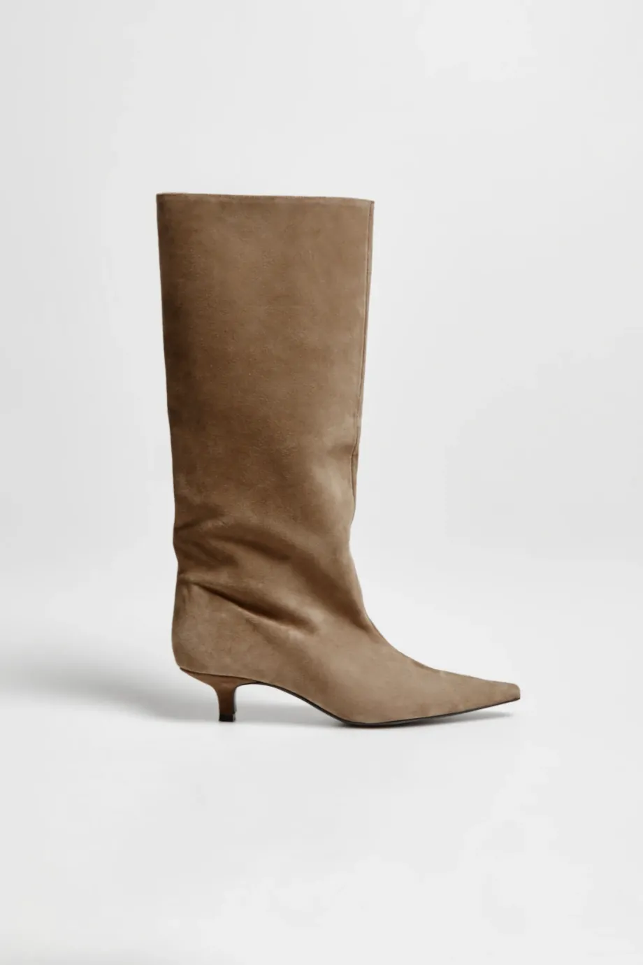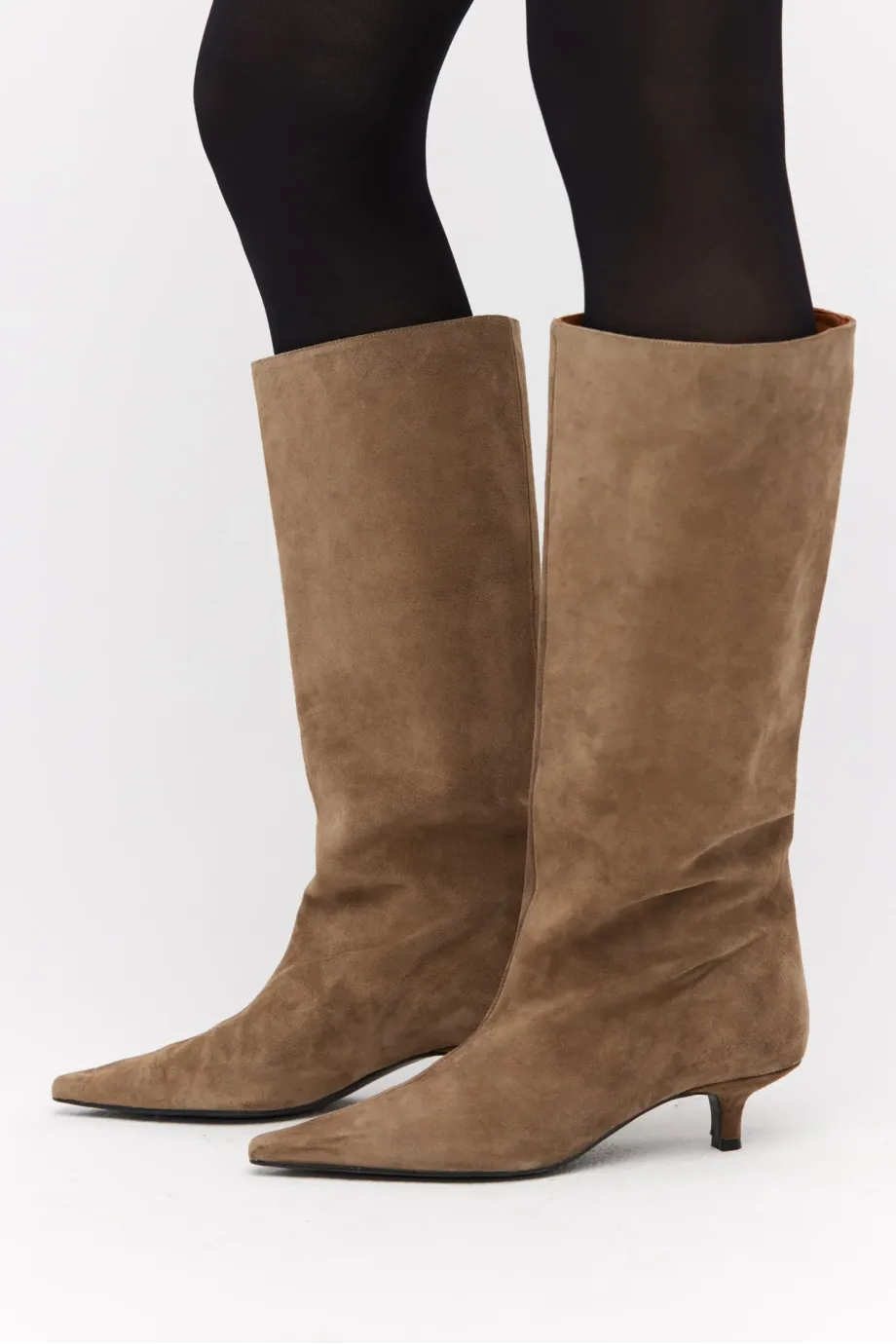 Herausziehbare Stiefel aus natürlichem Wildleder in Grünton. Schlanke, spitze Schuhspitze. Mittelhoher Kitten-Heel-Absatz. Minimalistisch. Handgefertigt in einer spanischen Manufaktur.