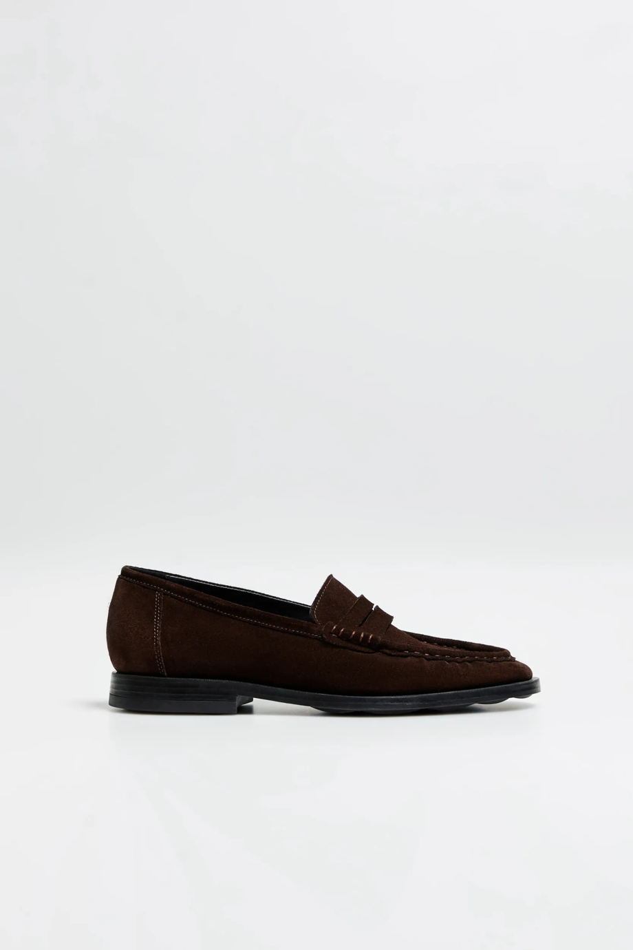 Loafers im minimalistischen Schnitt mit charakteristischem Penny-Riemen. Hergestellt aus hochwertigem, natürlichem Wildleder in Braun. Handgefertigt in einer polnischen Manufaktur.