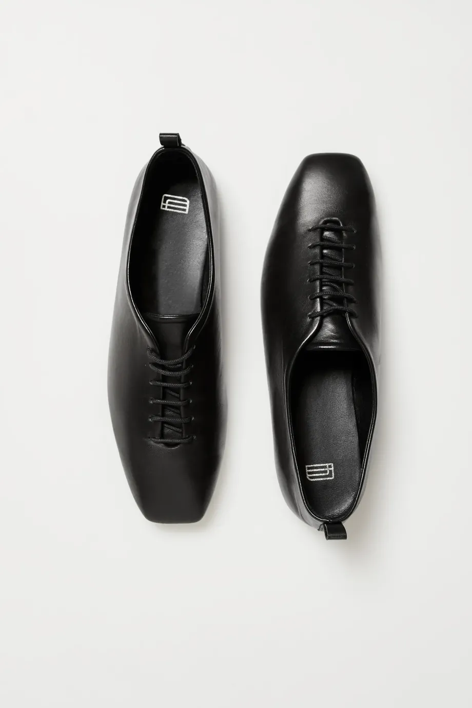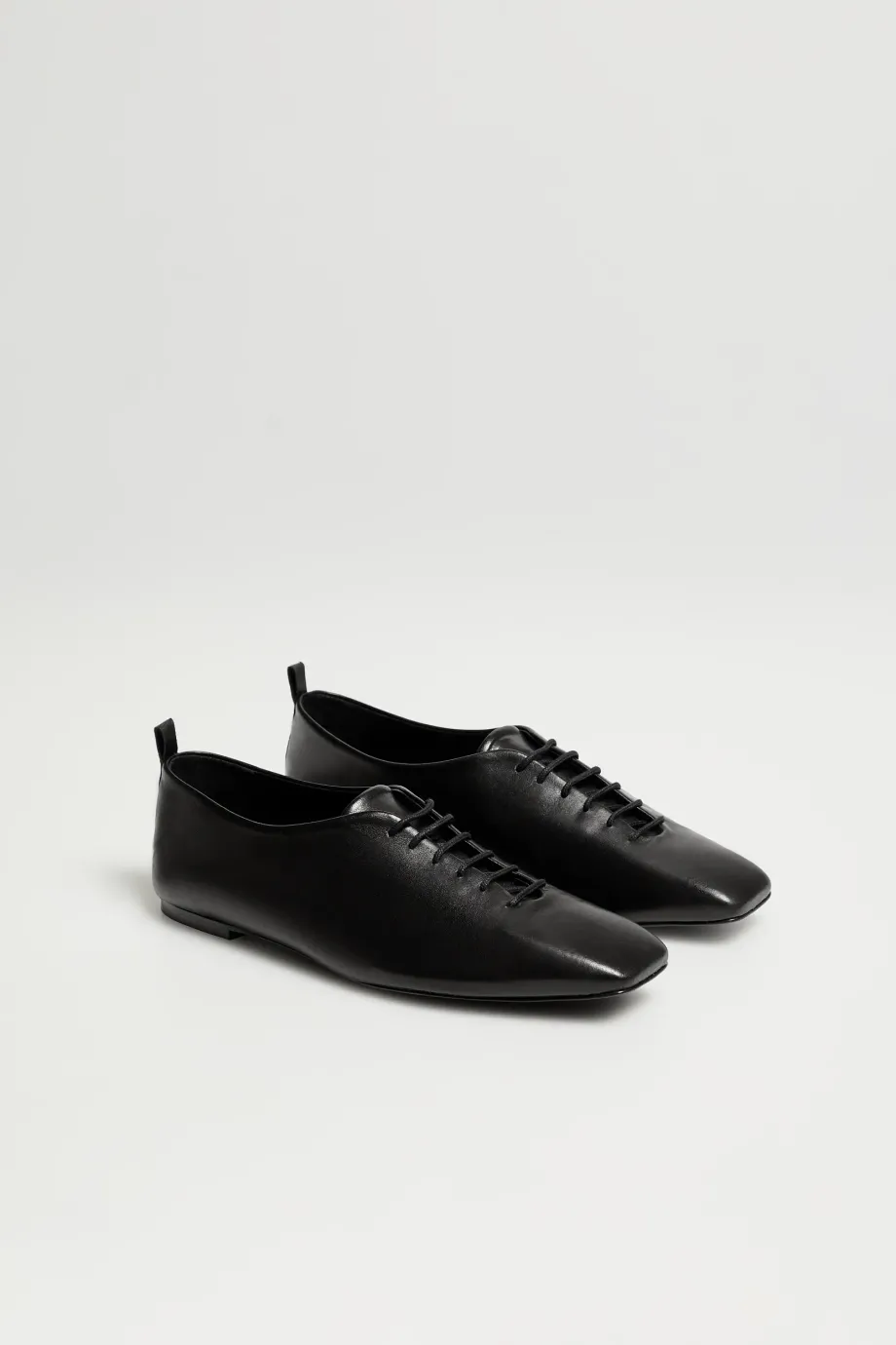 Ballerinas aus weichem Glattleder gefertigt. Niedriger Schaft mit vollständiger Schnürung. Mandelförmige, leicht verlängerte Spitze. Lederfutter und Innensohle. Dünne, flexible Sohle. Modell mit leichter Konstruktion. Handgefertigt in einer spanischen Manufaktur.