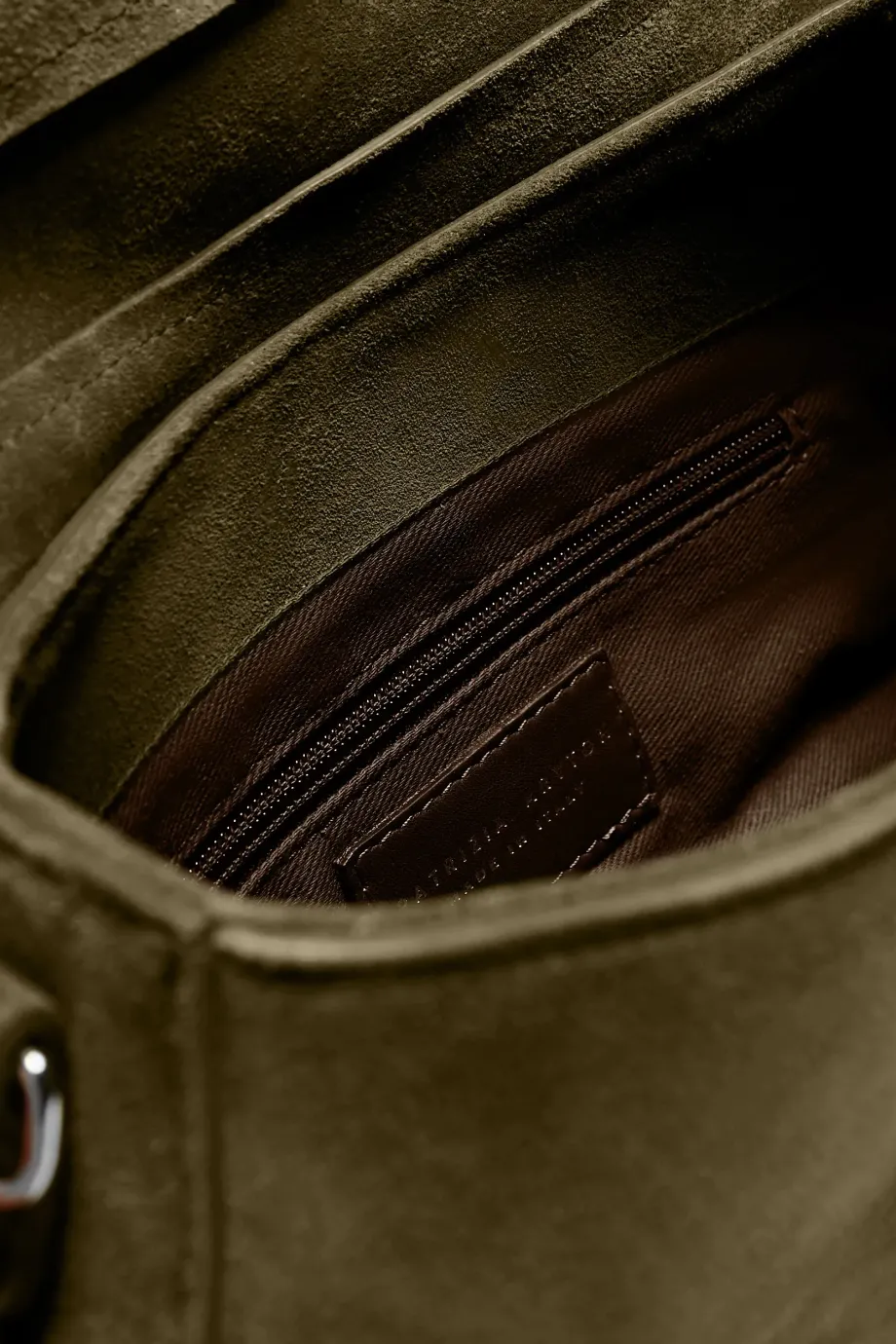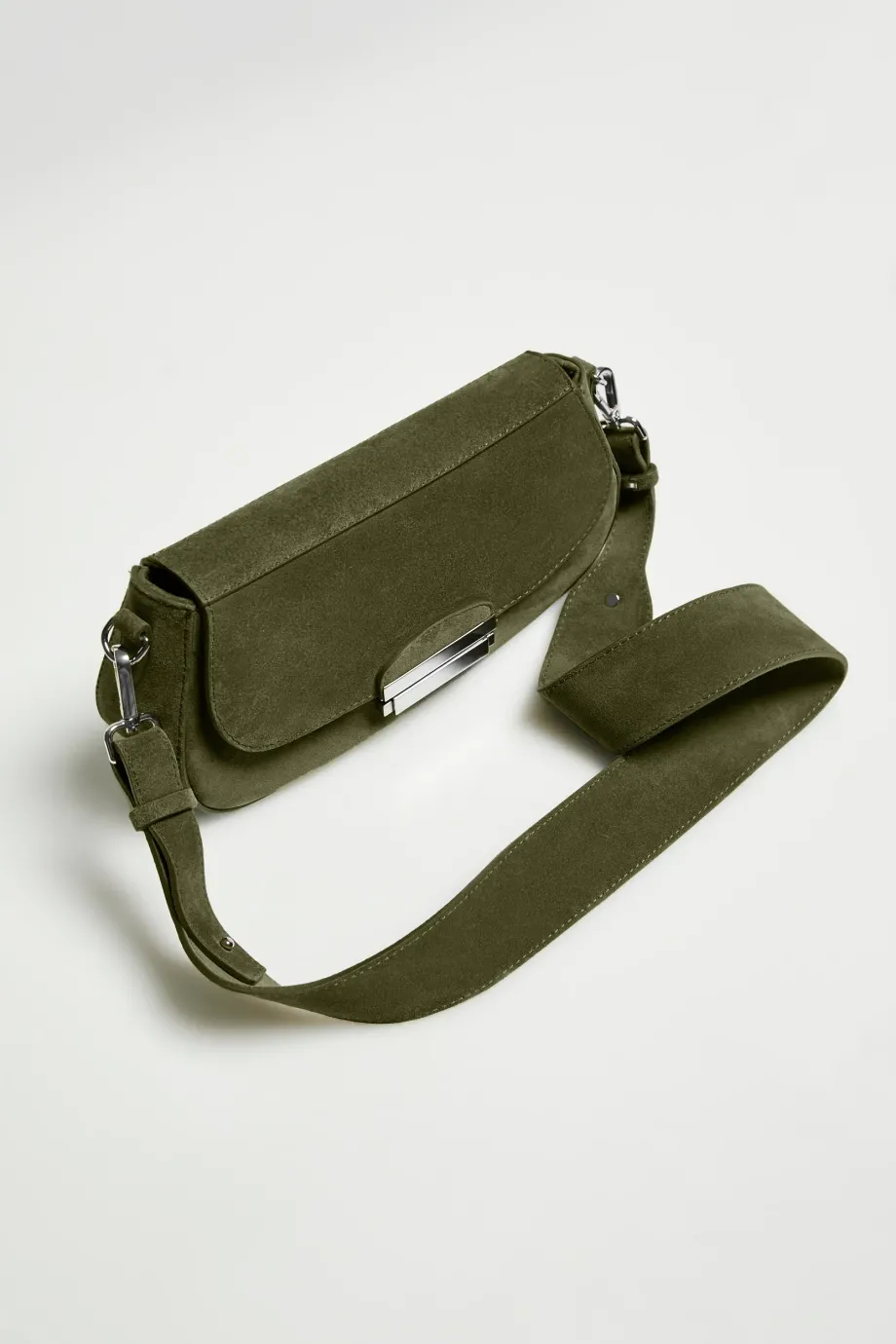 Kleine Tasche aus grünem Wildleder. In Italien gefertigt. Klassische Form mit Crossbody-Funktion – breiter Gurt und metallene Beschläge in Silberfarbe. Verschlossen mit Klappe und Metallverschluss. Innen Futter und kleine Reißverschlusstasche.