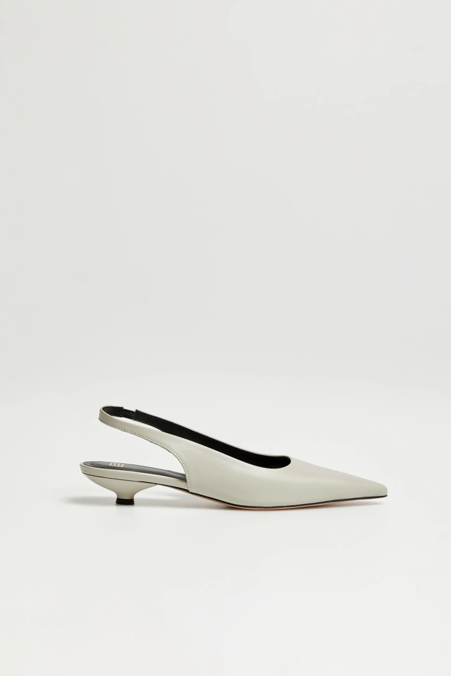 Slingback-Schuhe mit offener Ferse und Riemen mit elastischem Einsatz. Schlanke, spitz zulaufende Kappe und niedriger Kitten-Heel-Absatz. Aus weichem, natürlichem Leder gefertigt. Farbe hellgrün. Handgefertigt in einer polnischen Manufaktur.