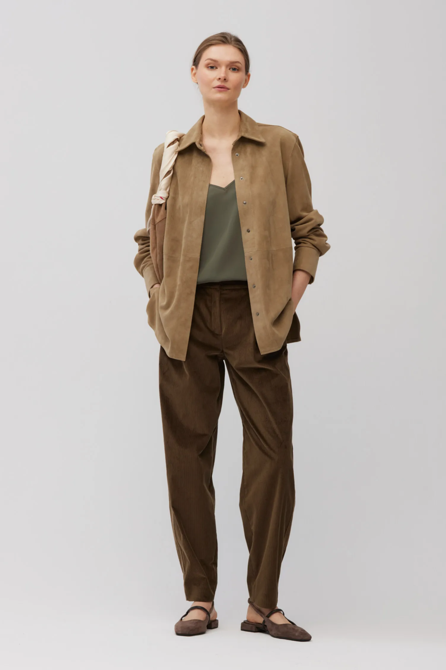 Hergestellt aus weichem, natürlichem Wildleder. Klassischer Kragen, gerade Passform. Lange Ärmel mit Manschettenabschluss. Verschluss mit Metallknöpfen. Farbe: Beige.