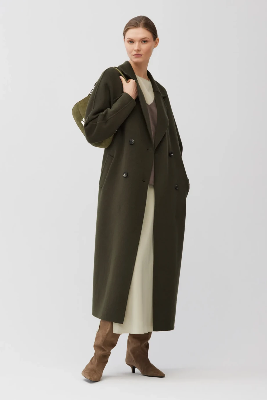 Zweireihiger Mantel aus Doubleface-Stoff - Mischung aus Wolle und Seide. Knielang, Gürtel in der Taille, Kragen mit Revers. Leicht, ungefüttert. Farbe: Dunkelgrün.