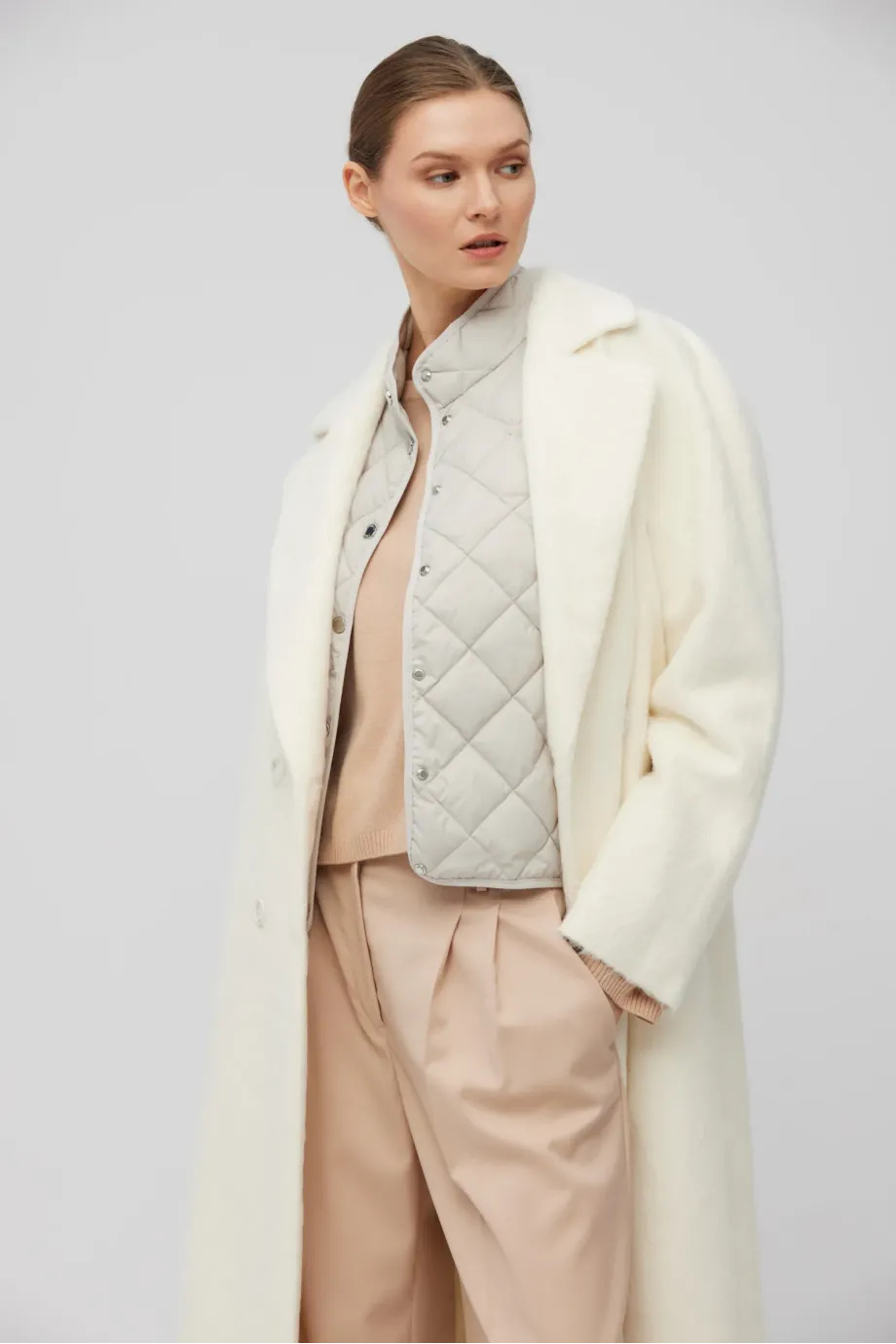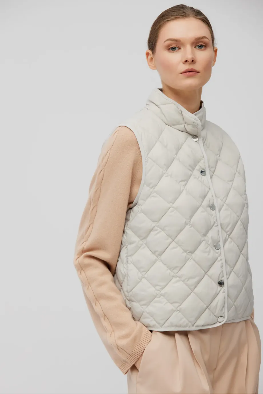 Weste mit natürlicher, dauniger Füllung. Gerader, kurzer Schnitt mit Druckknöpfen. Beige Farbe. Zum eigenständigen Tragen oder als wärmende Schicht unter einem Mantel.