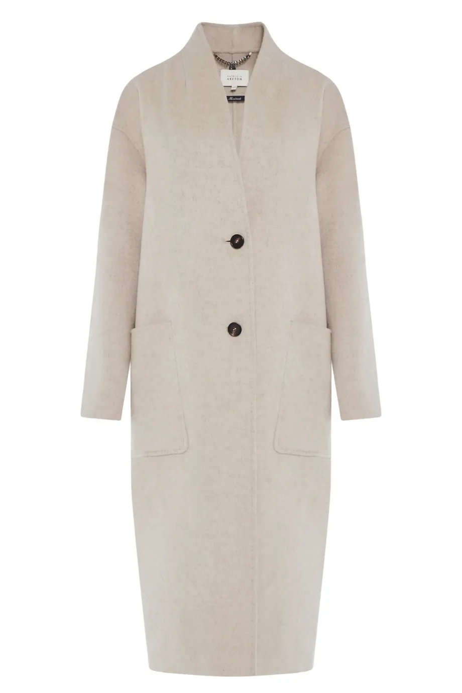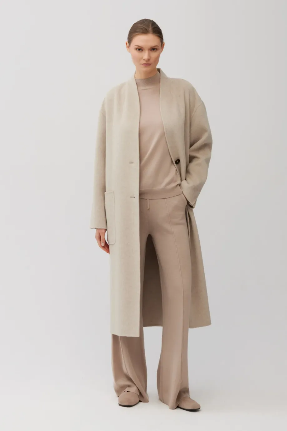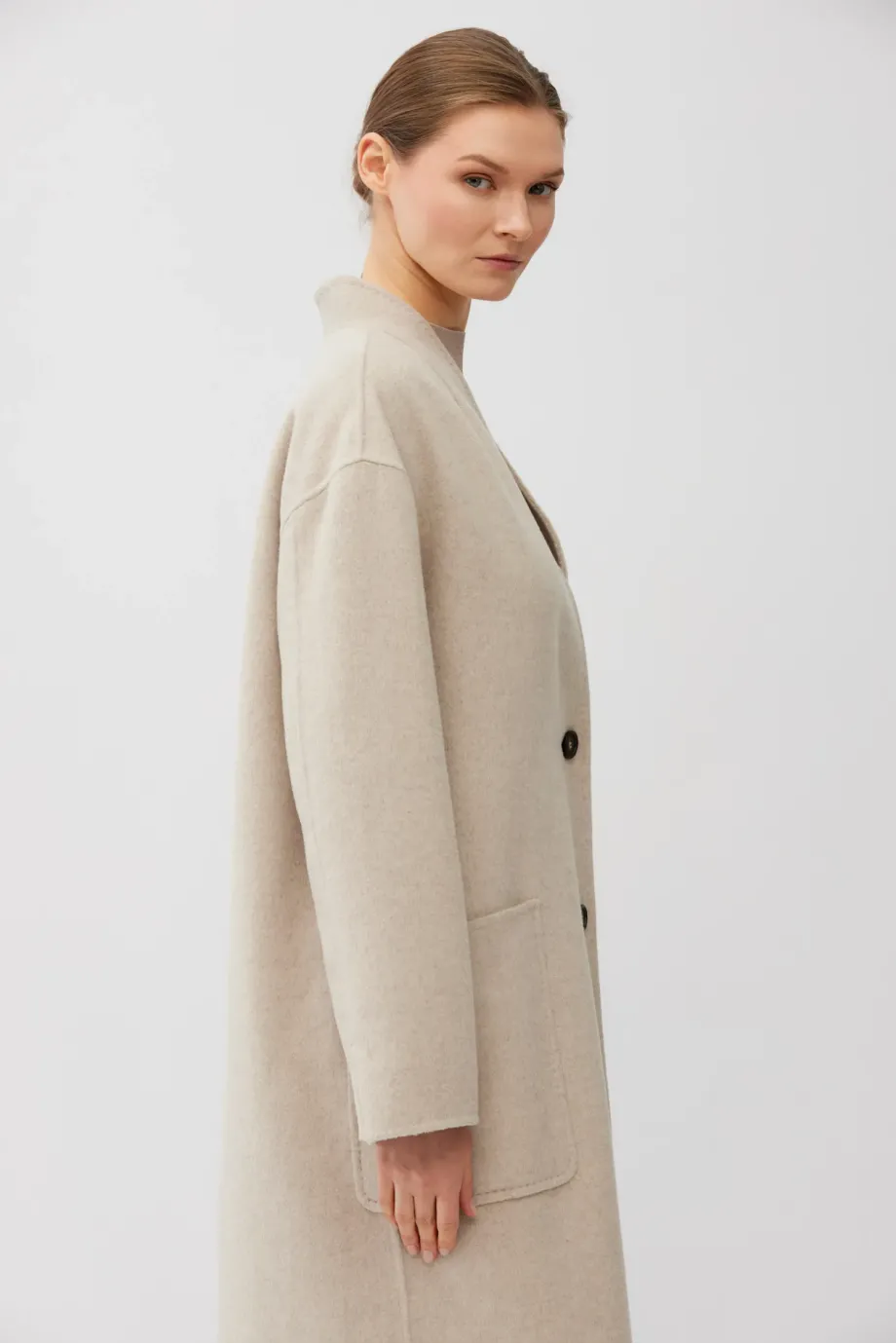 Einknopf-Mantel mit einfachem Schnitt, aus Doubleface-Stoff – einer Mischung aus Wolle und Seide. Midi-Länge. Stehkragen, aufgesetzte Taschen, Schlitz hinten. Verschluss mit kontrastierenden Knöpfen. Leichtes, ungefüttertes Modell, handgefertigt verarbeitet.