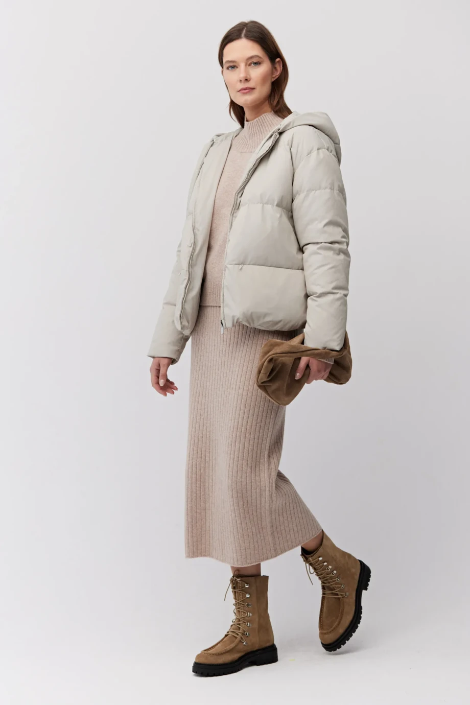 Wendbare Jacke in Beige mit Kapuze, gefüllt mit natürlicher Daune. Leicht, mit Reißverschluss und Taschen.