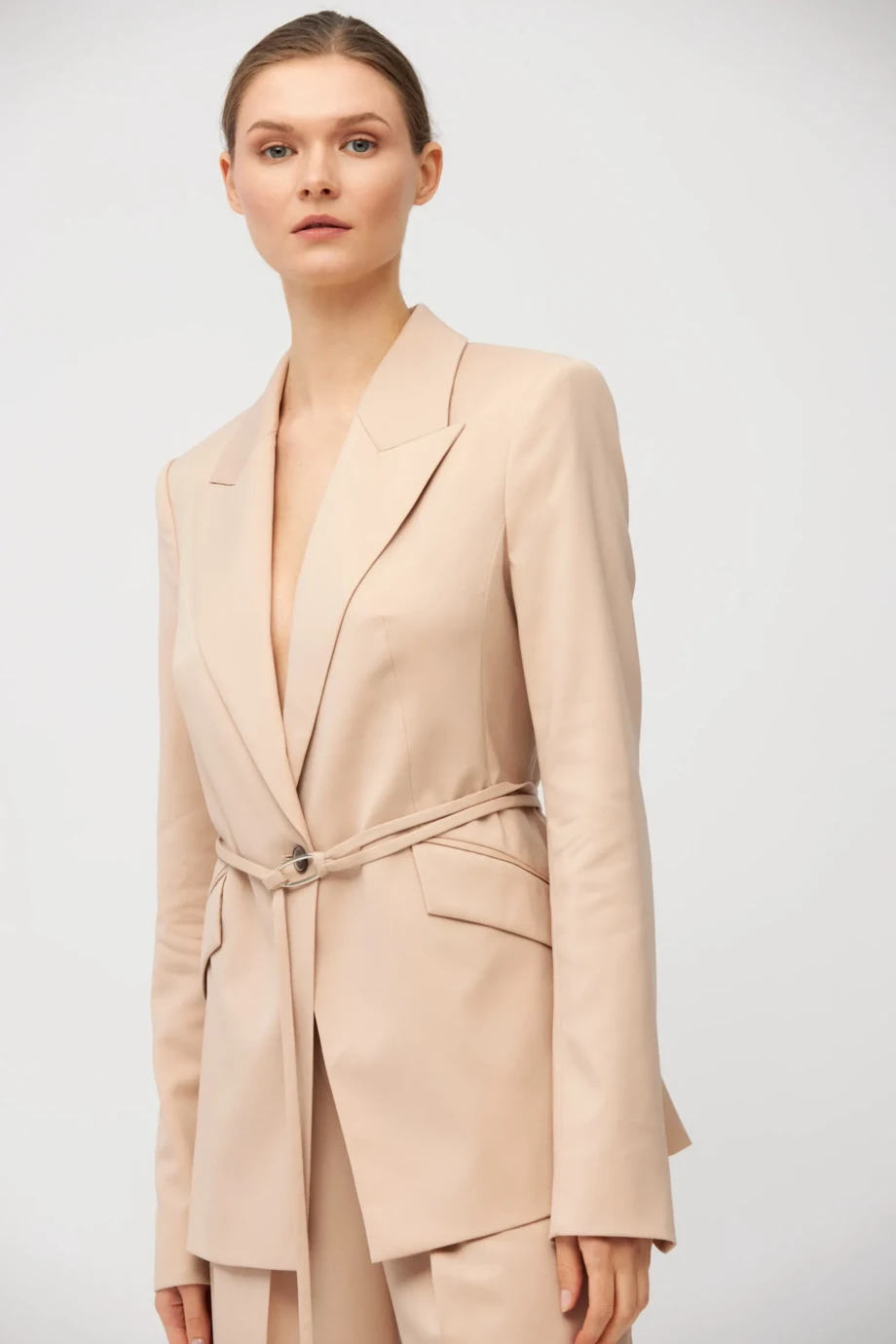 Taillierter Blazer aus neuwolliger Wolle in pudrigem Rosa. Verschluss mit einem Knopf aus Perlmutt. Sanft betonte Schulternlinie. Modell leicht tailliert, lange Ärmel, Kragen. Taschen mit Patten. Komplett mit Futter. Passend dazu Hose aus dem gleichen Stoff.