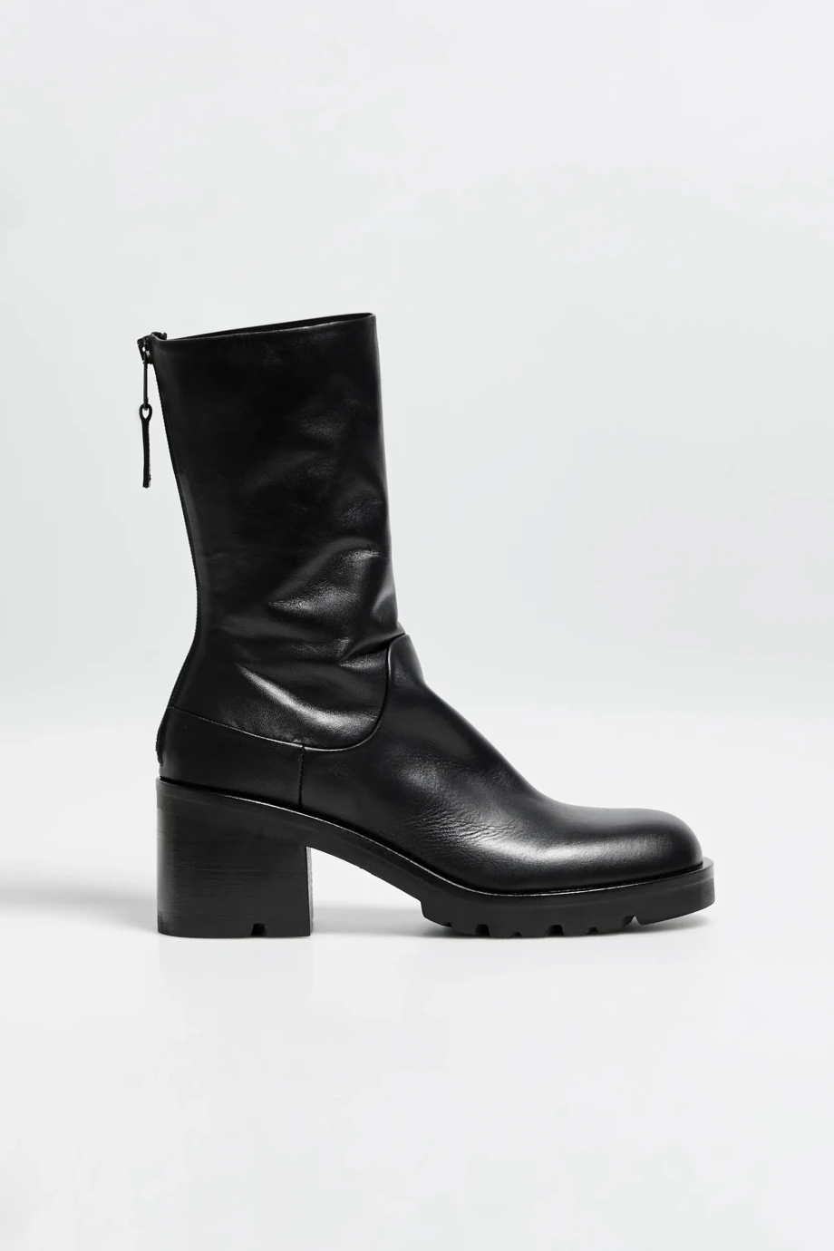 Schwarze Stiefeletten mit hohem Schaft aus Glattleder. Verschluss hinten. Stabile, massive Sohle. Handgefertigt in einer italienischen Manufaktur.