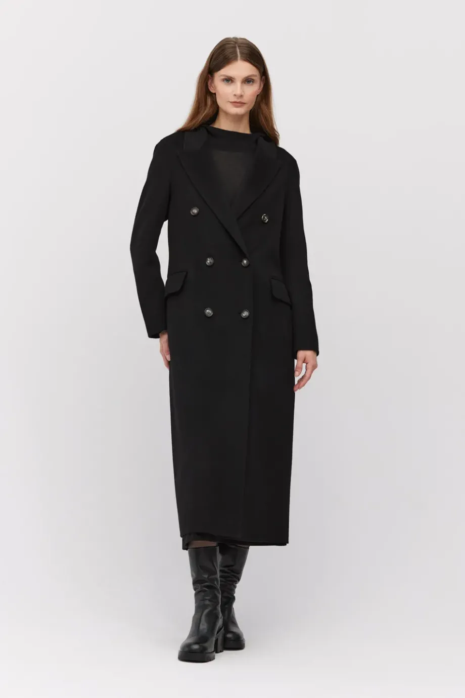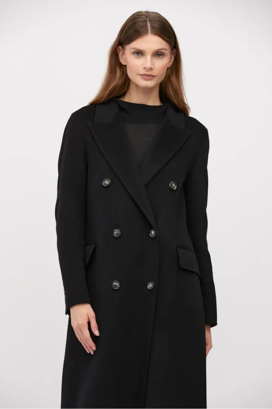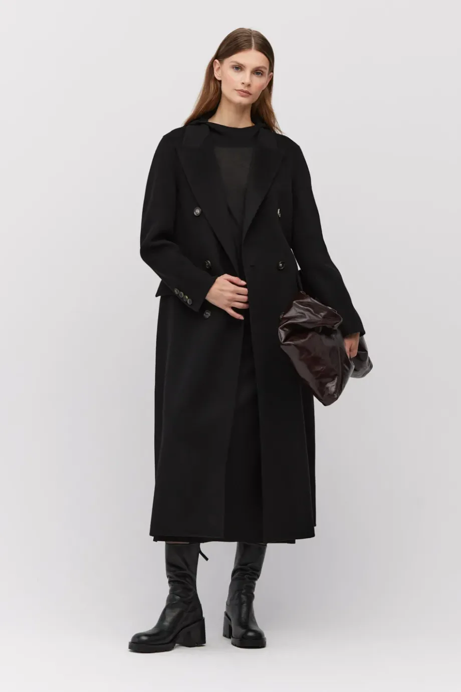 Zweireihiger Mantel in schlichter Form, gefertigt aus Doubleface-Gewebe – 100% Kaschmir. Maxi-Länge. Klassischer Kragen, Taschen, Schlitz hinten. Knopfverschluss. Leichtes, ungefüttertes Modell, handgearbeitet. Farbe Schwarz.