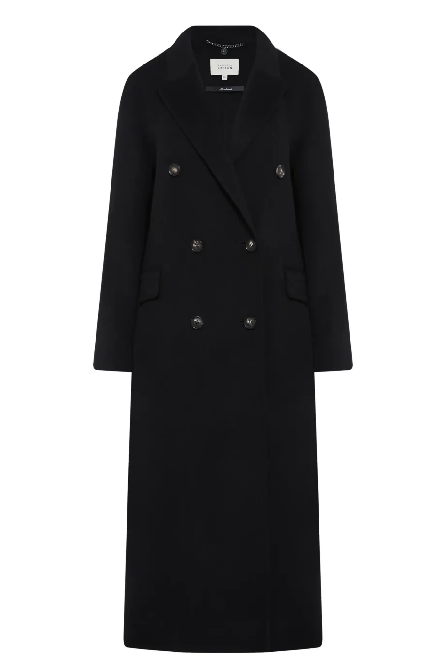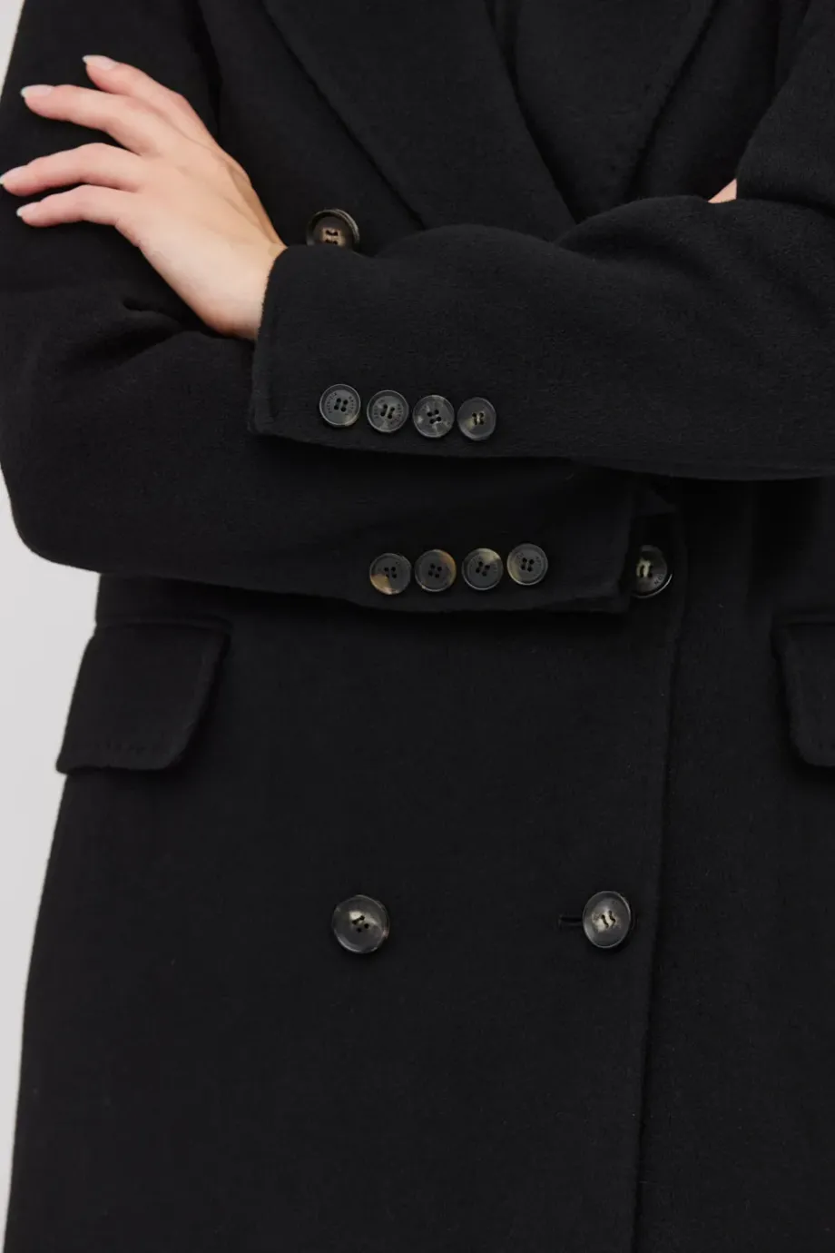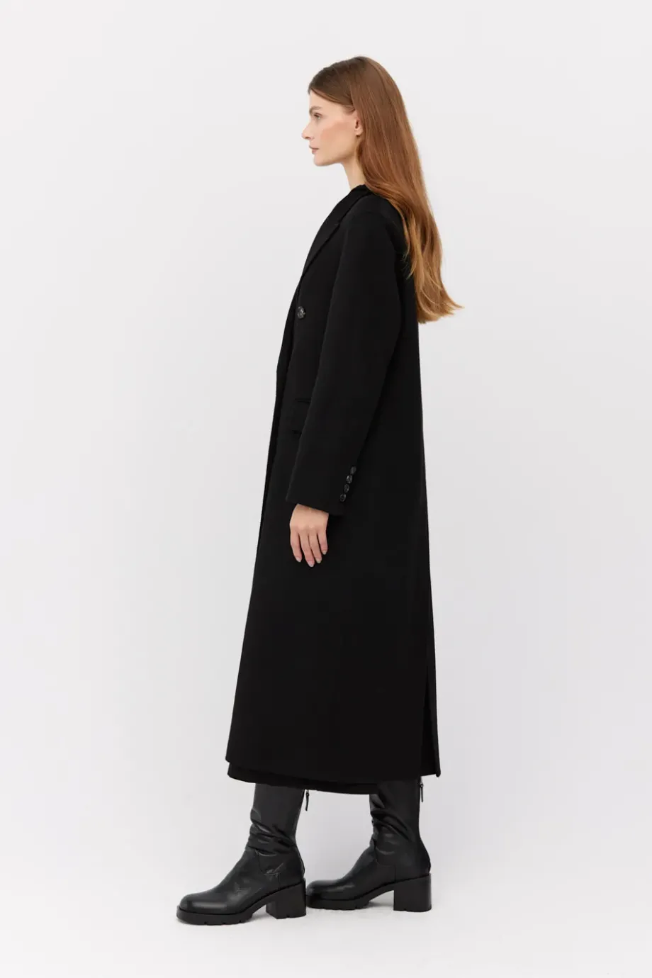 Zweireihiger Mantel in schlichter Form, gefertigt aus Doubleface-Gewebe – 100% Kaschmir. Maxi-Länge. Klassischer Kragen, Taschen, Schlitz hinten. Knopfverschluss. Leichtes, ungefüttertes Modell, handgearbeitet. Farbe Schwarz.