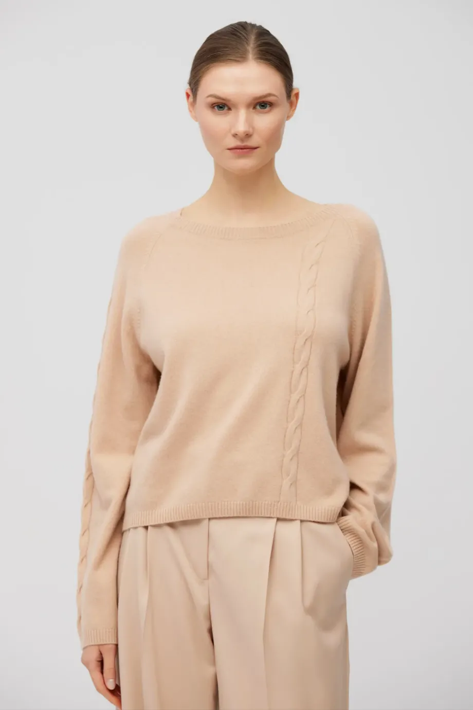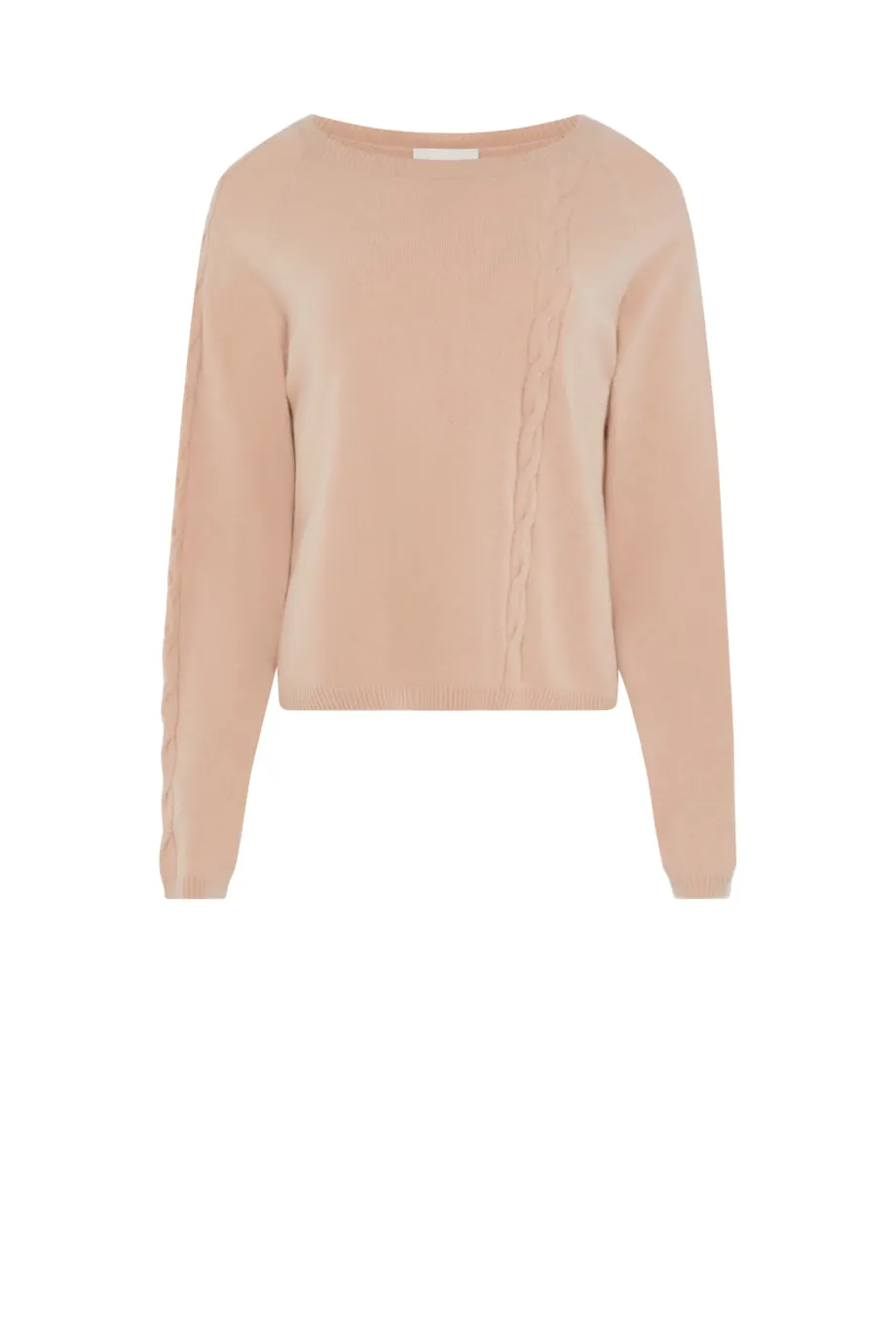 Sehr weiches Baby-Kaschmir-Gewebe. Lockerer Schnitt mit langen Ärmeln, gefertigt mit einer Maschenweite von 12 GG im Jersey-Strick. Zopfstrickmuster auf Vorderseite und Ärmeln. Farbe pudriges Rosa.