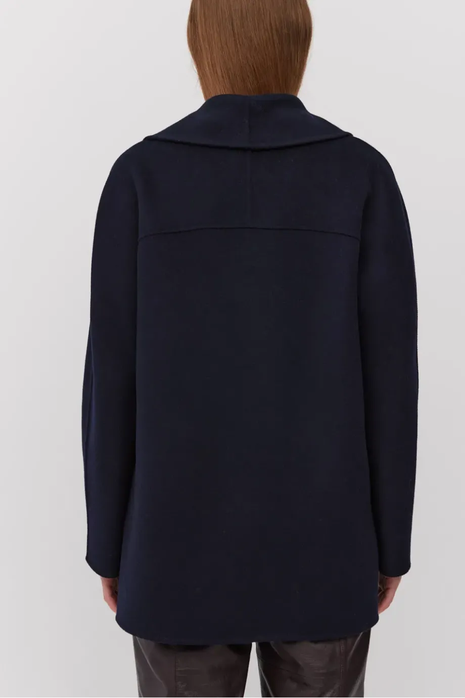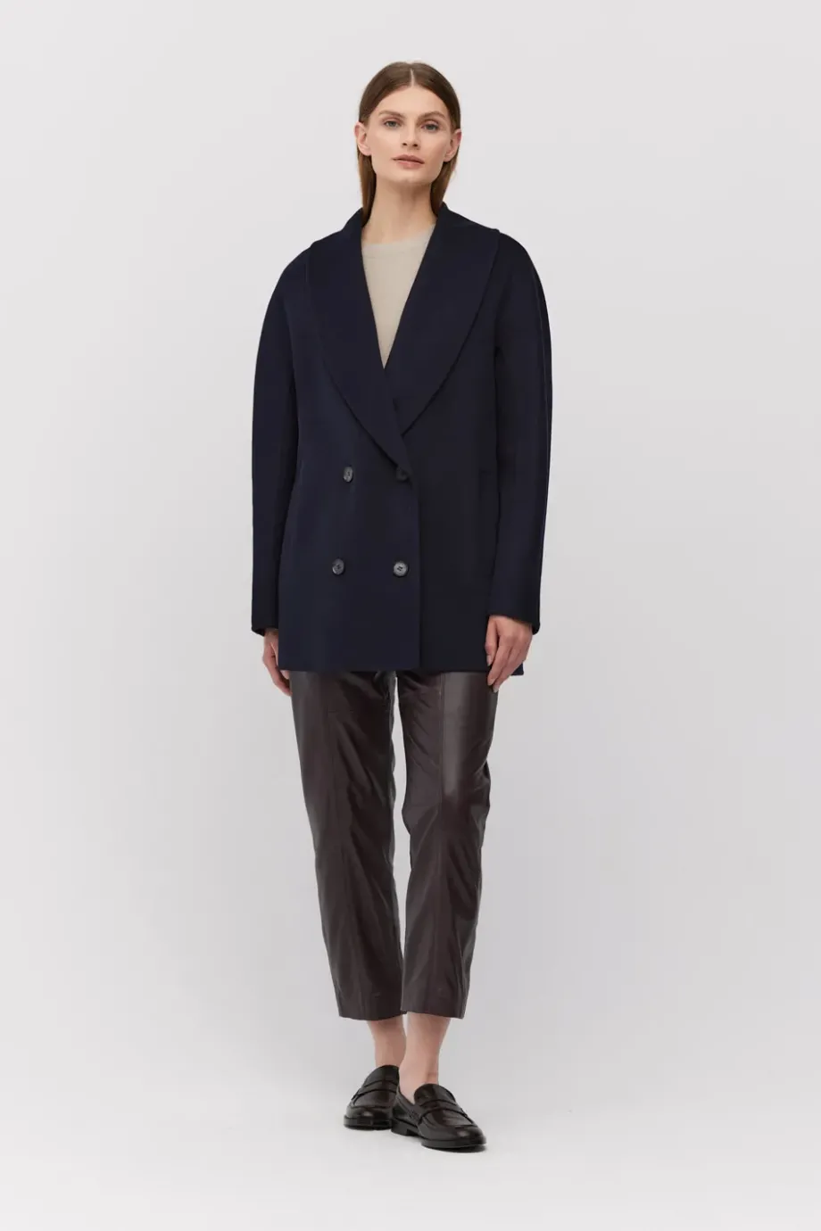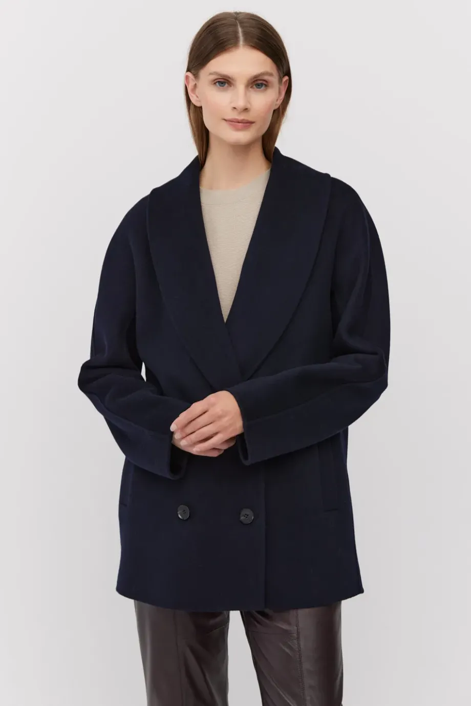Leichte, ungefütterte Jacke in schlichter, lockerer Form. Doubleface-Gewebe – Mischung aus Wolle und Seide. Zweireihiges Modell mit Taschen und Schalkragen. Farbe Dunkelblau.