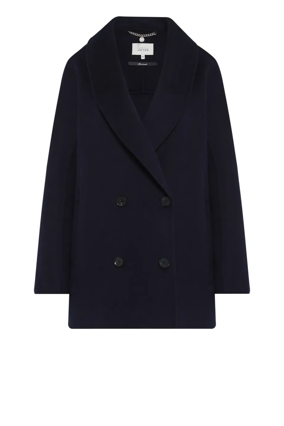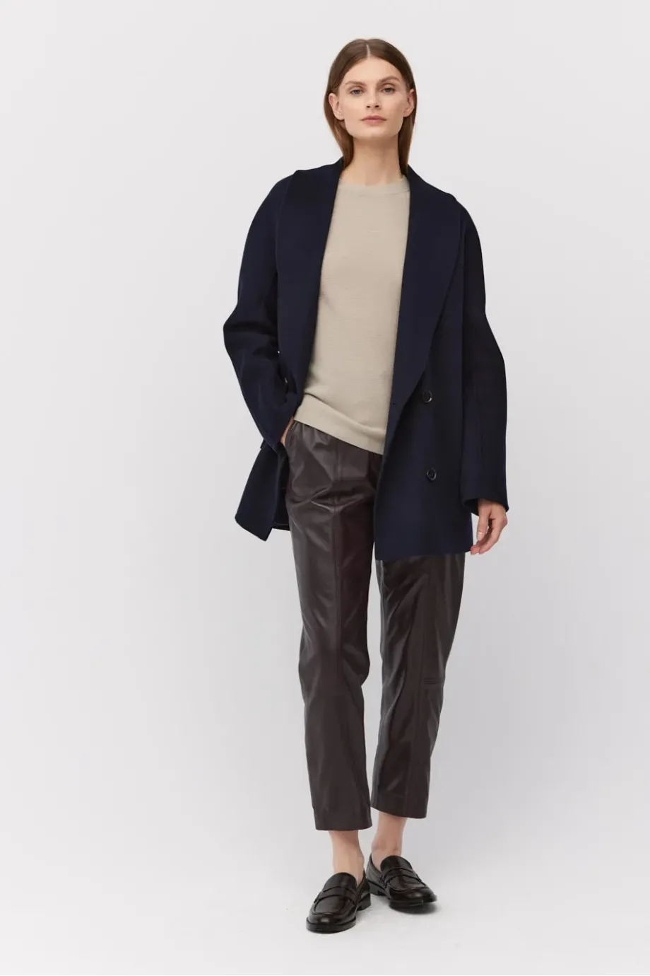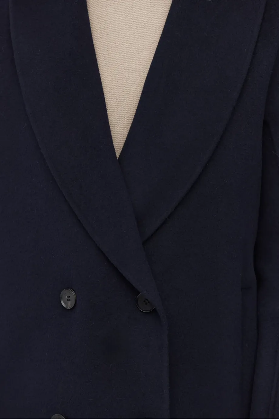 Leichte, ungefütterte Jacke in schlichter, lockerer Form. Doubleface-Gewebe – Mischung aus Wolle und Seide. Zweireihiges Modell mit Taschen und Schalkragen. Farbe Dunkelblau.