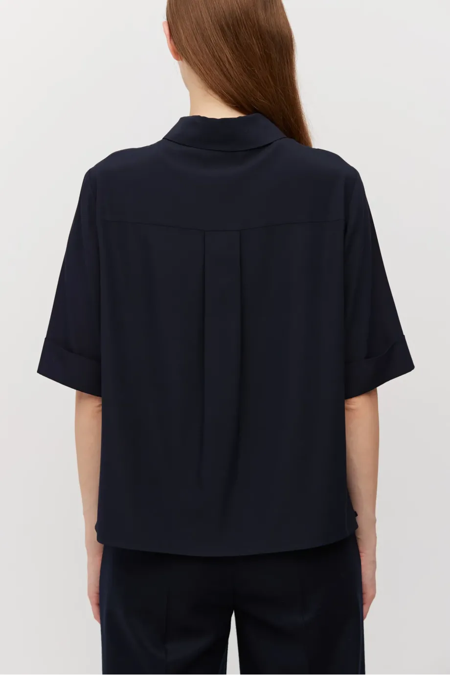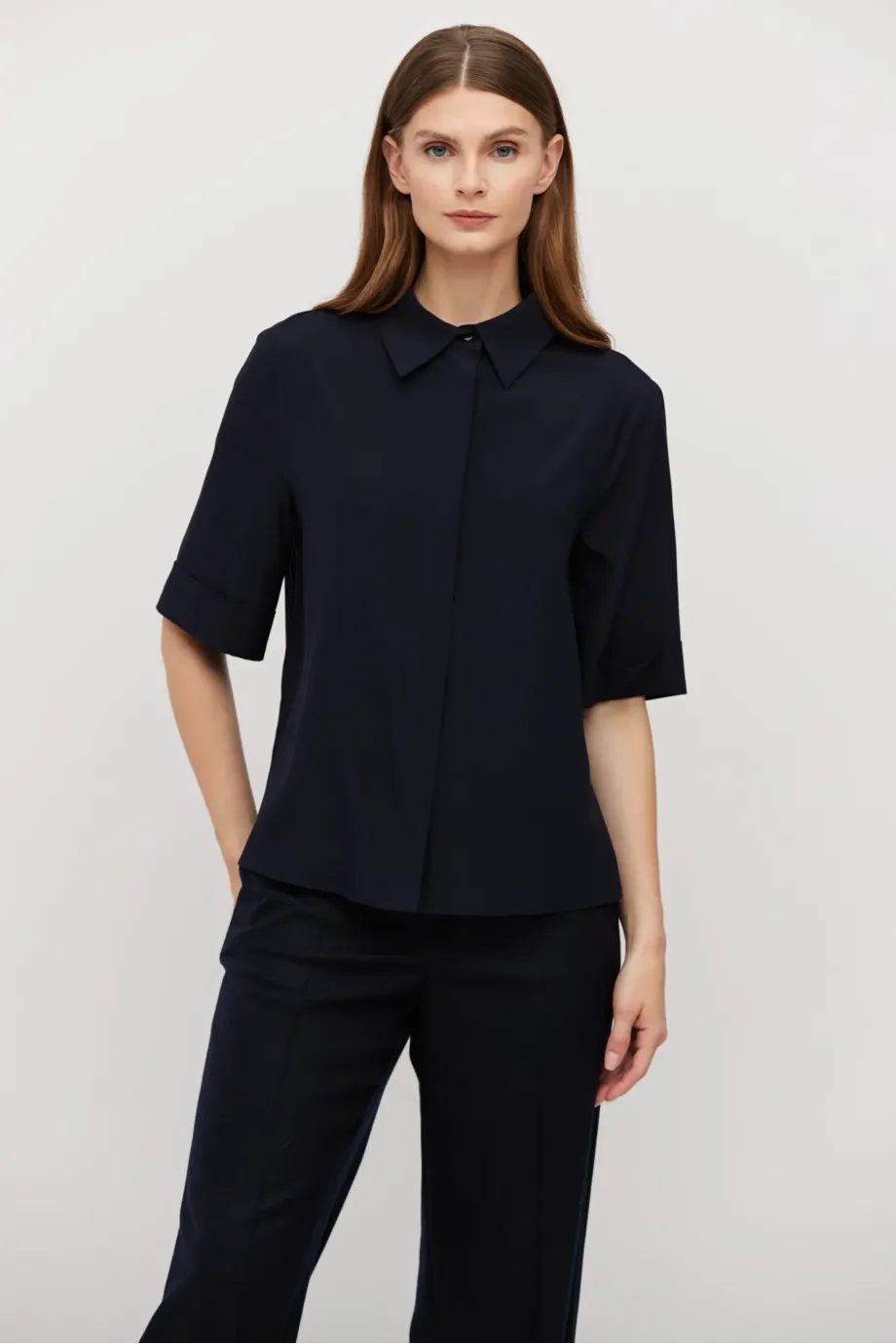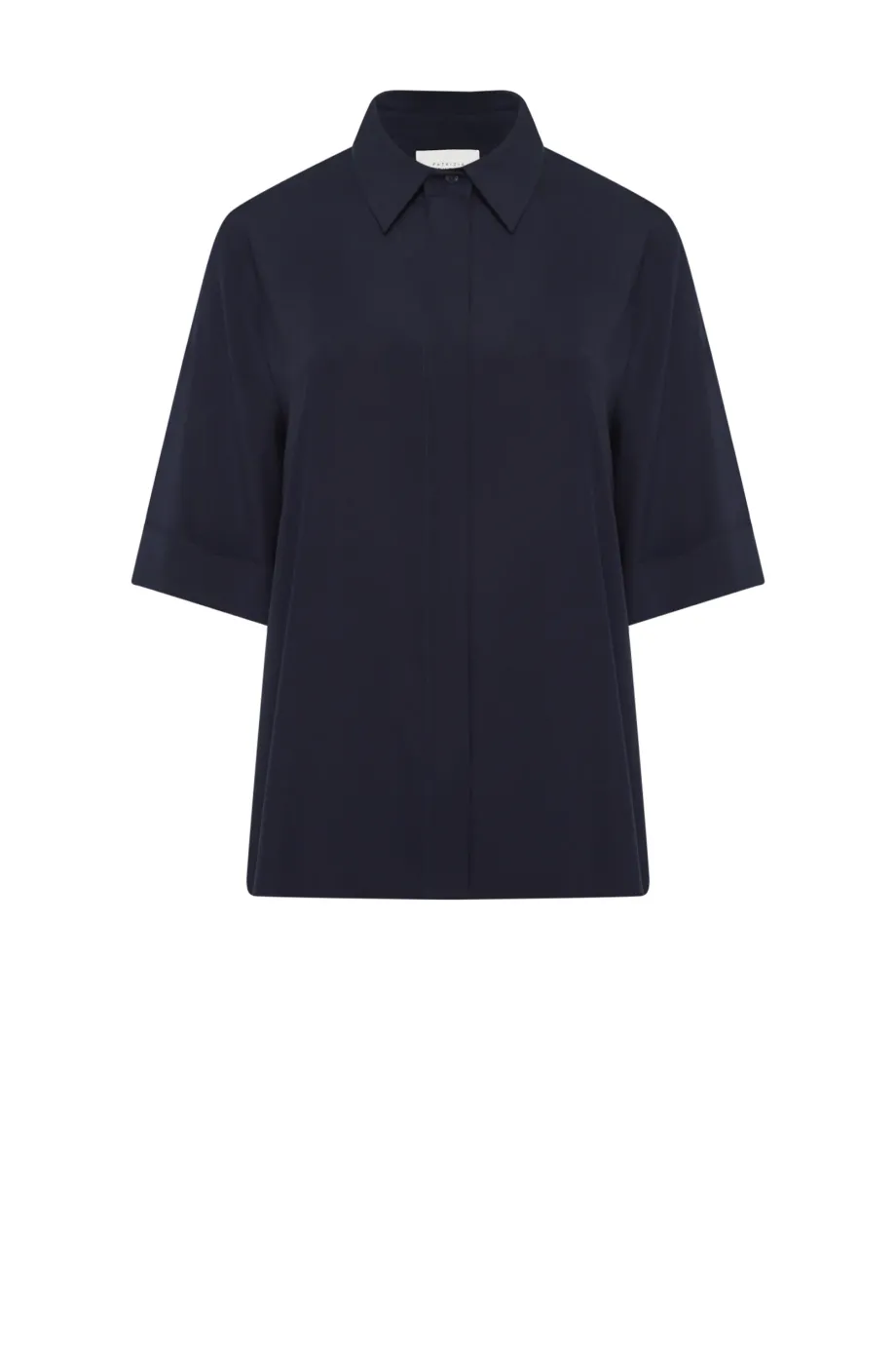 Dunkelblaue Bluse aus Seide mit lockerem Schnitt. Klassischer Kragen, kurzer Ärmel und Knopfverschluss