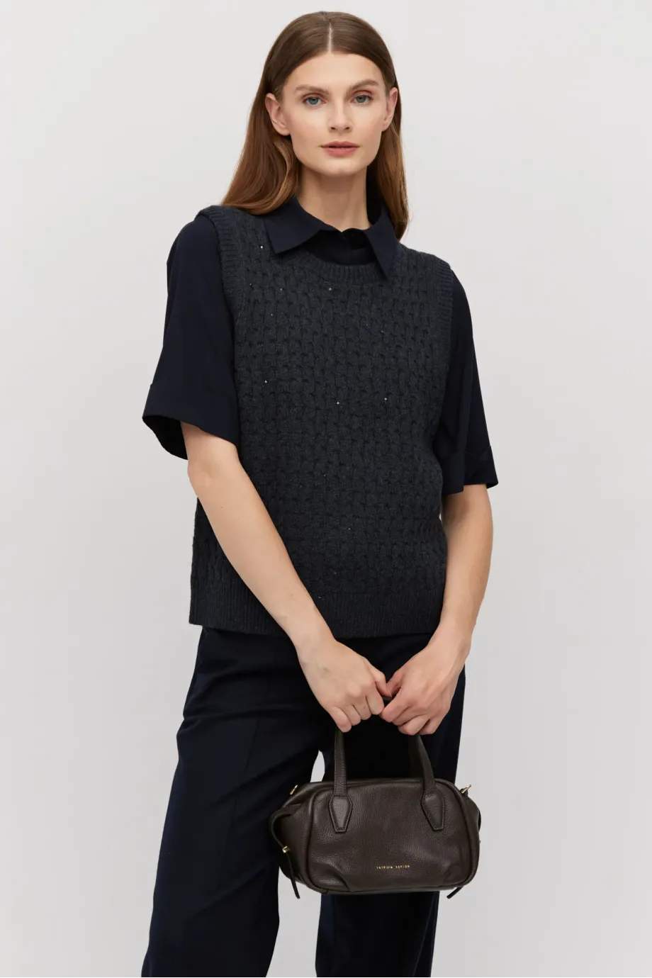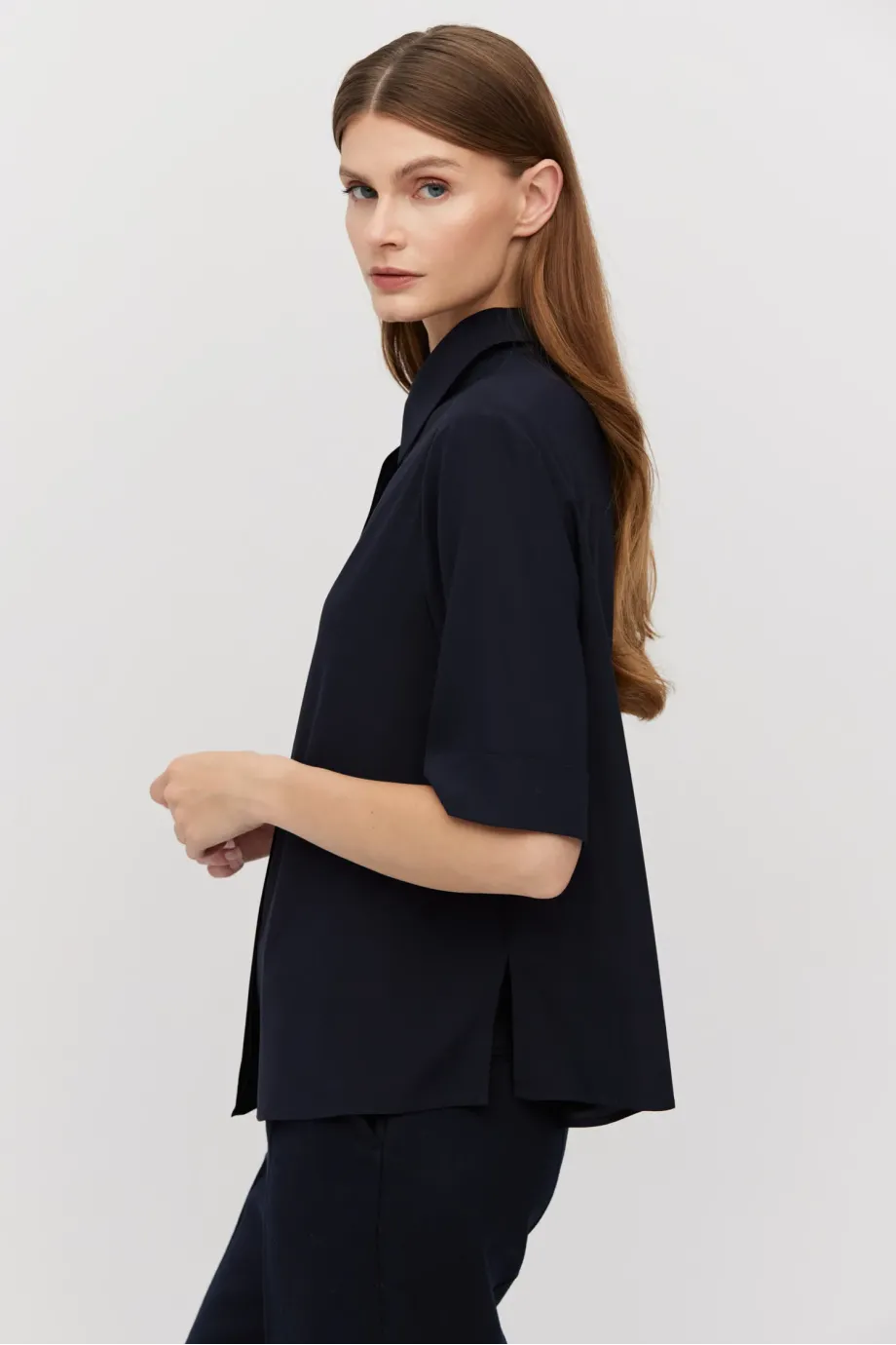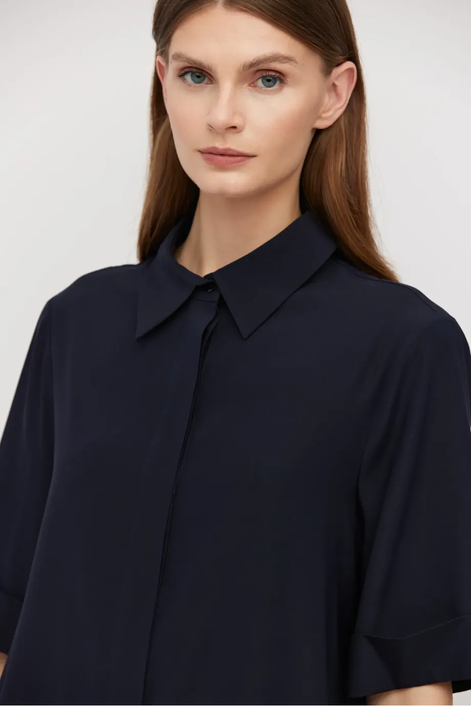 Dunkelblaue Bluse aus Seide mit lockerem Schnitt. Klassischer Kragen, kurzer Ärmel und Knopfverschluss