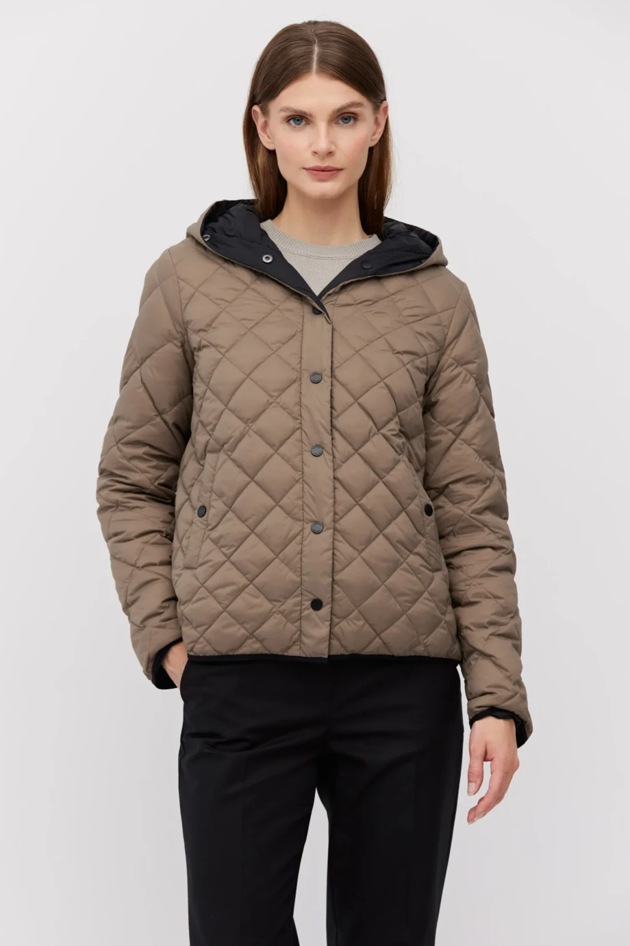 Wendbare Jacke mit Kapuze in Hellbraun und Schwarz, gefüllt mit natürlicher Daune. Leicht, mit Druckknopfverschluss und Taschen. Kann eigenständig getragen oder als zusätzliche Wärmeschicht unter einem Mantel genutzt werden.