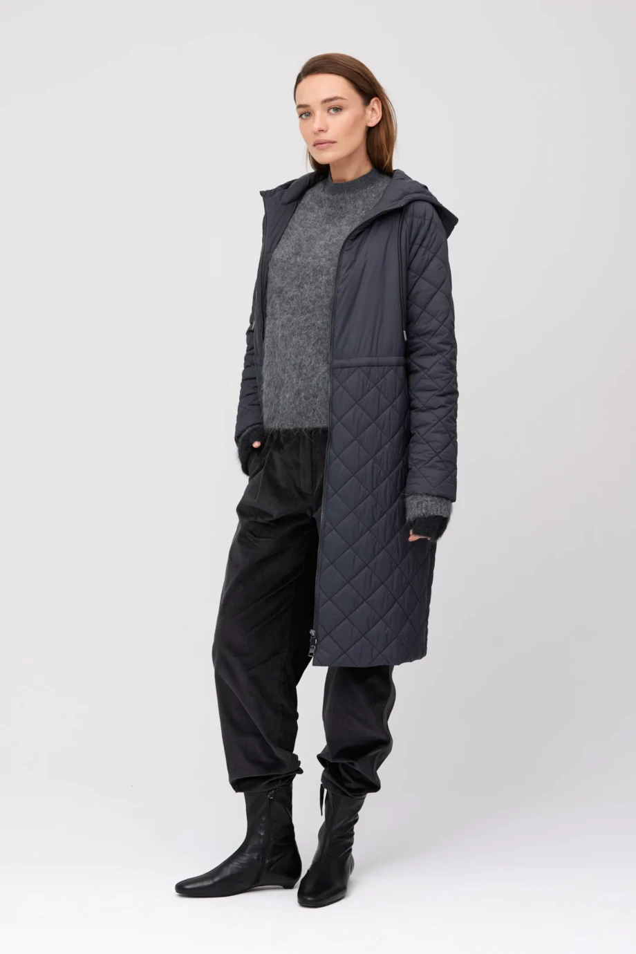 Jacke mit Kapuze und Füllung aus Kamelwolle. Lockere Form, Reißverschluss, verstellbare Kapuze, Taschen. Farbe Dunkelgrau.