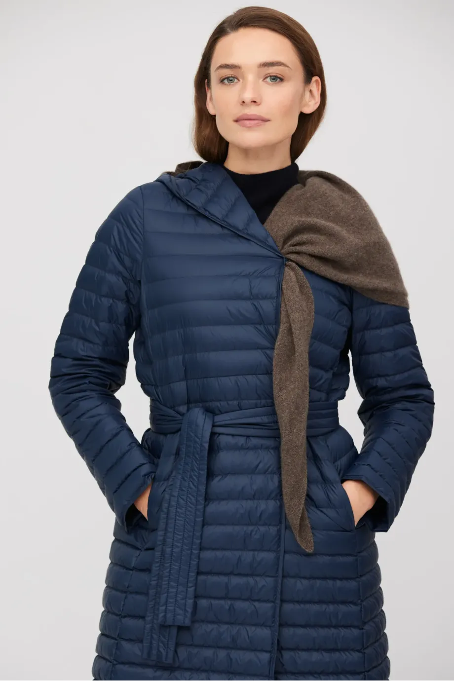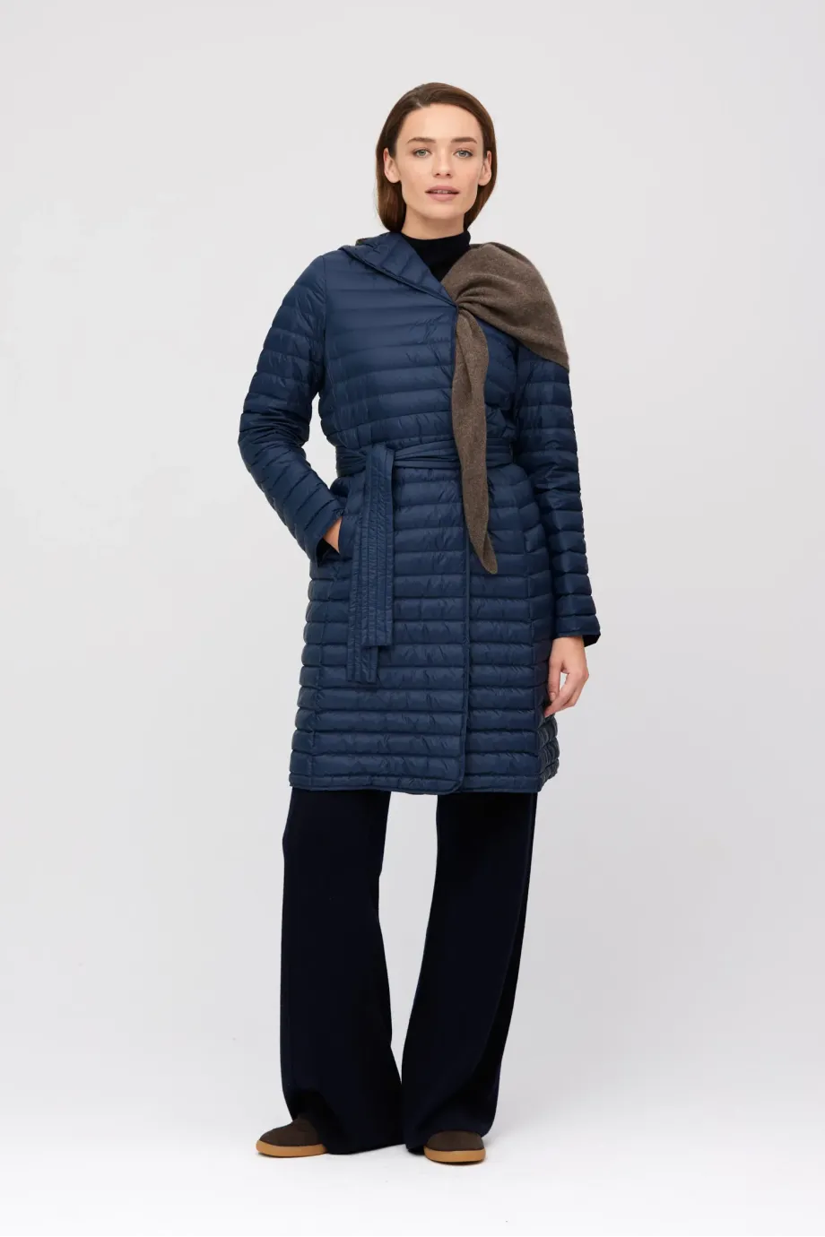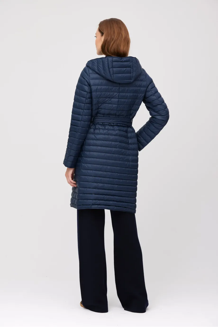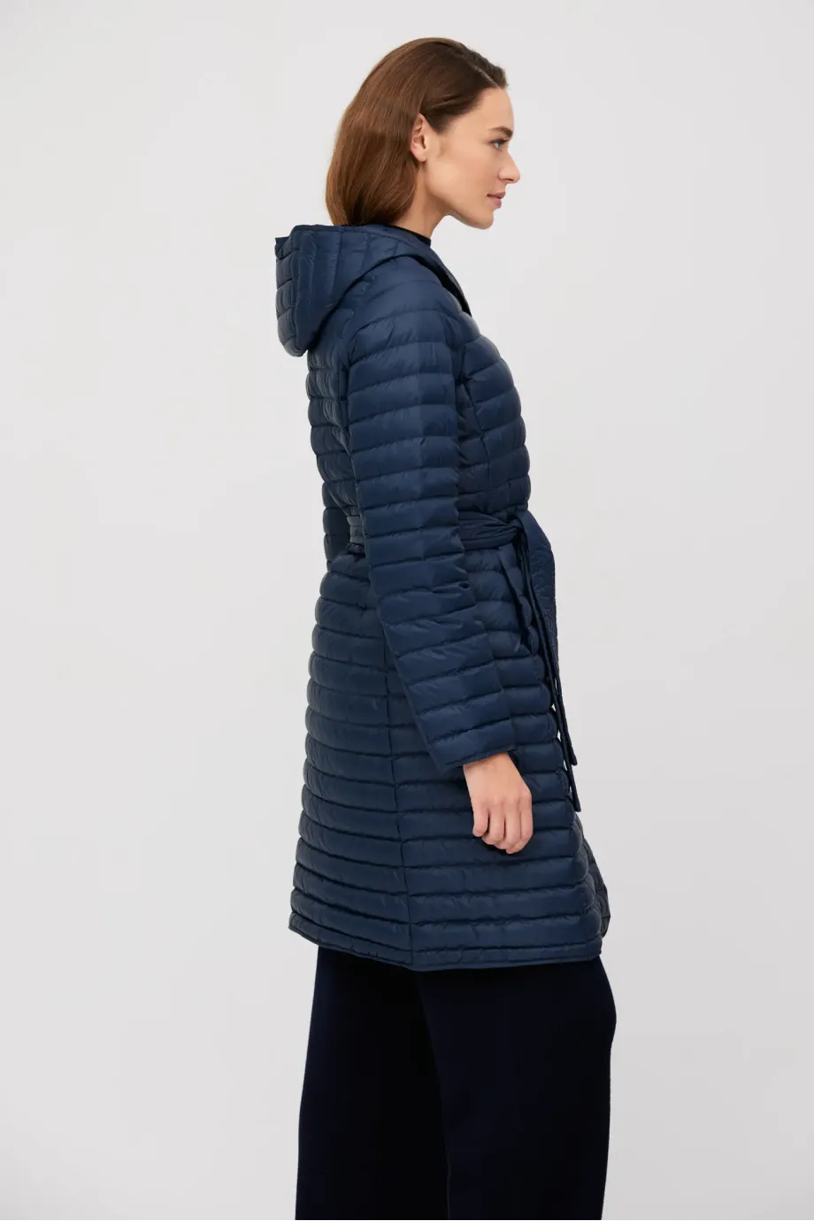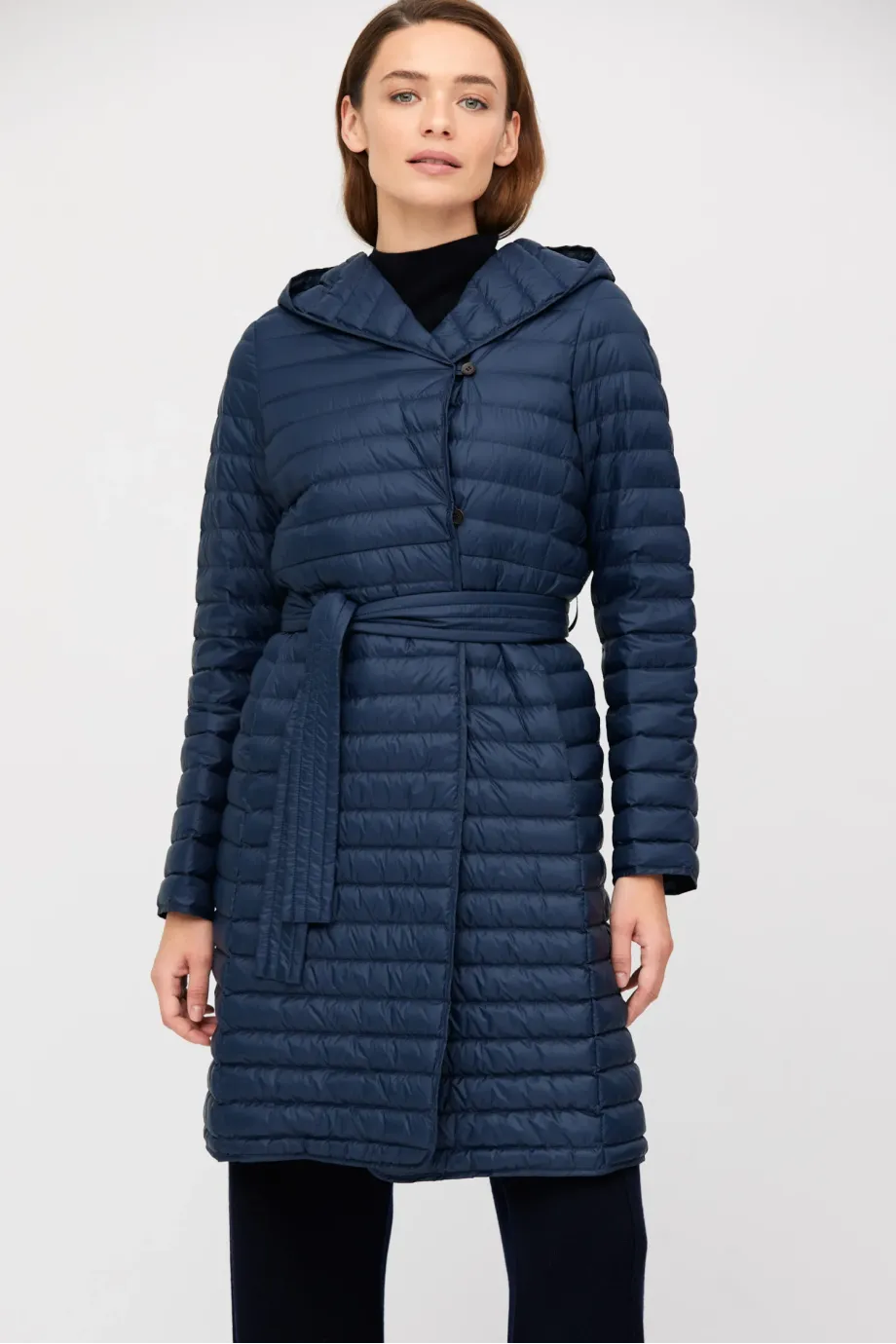 Leichte Damenjacke mit Kapuze Daunenjacke, dunkelblau Natürliches Futter Verschluss: Jacke mit Gürtel und Knöpfen Langer Mantel, Midi-Länge Zum eigenständigen Tragen oder als zusätzliche Wärmeschicht unter einem Mantel