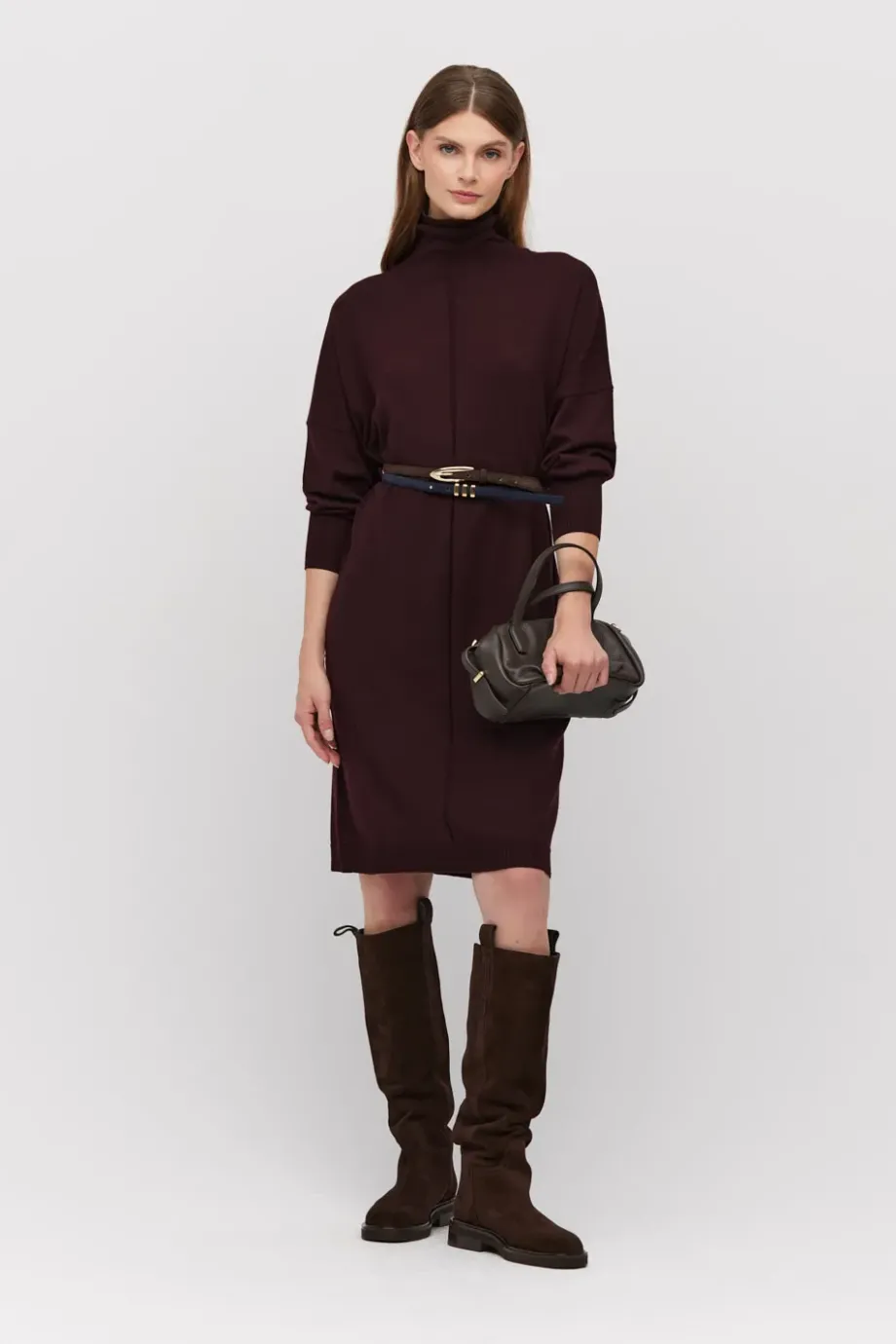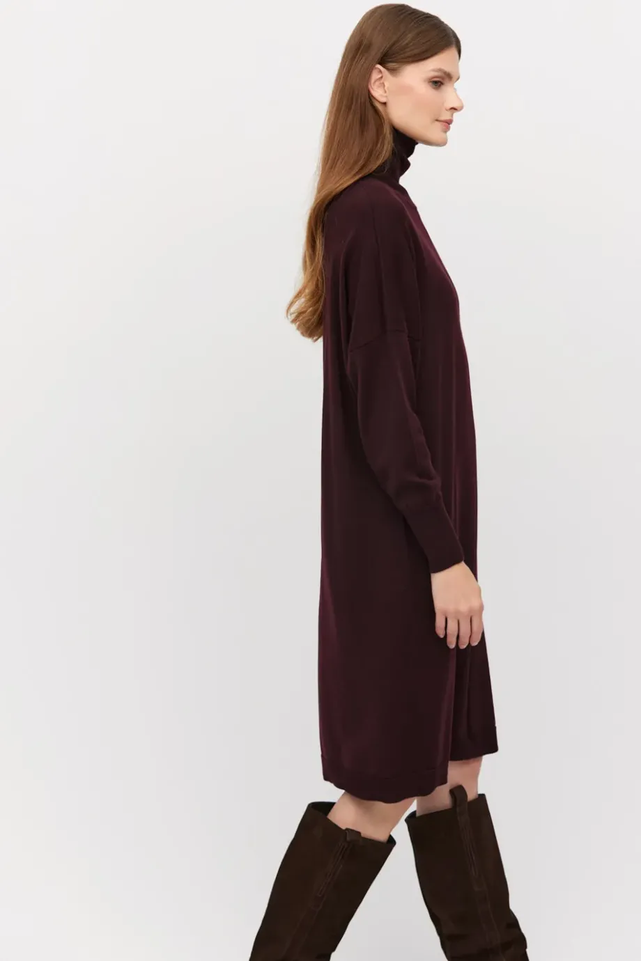 Rollkragenkleid aus Merinowolle in Auberginenfarbe. Midilänge, mit langem Ärmel und lockerem Schnitt. Gestrickt im feinen Single-Jersey auf einer Maschine mit 14 GG.