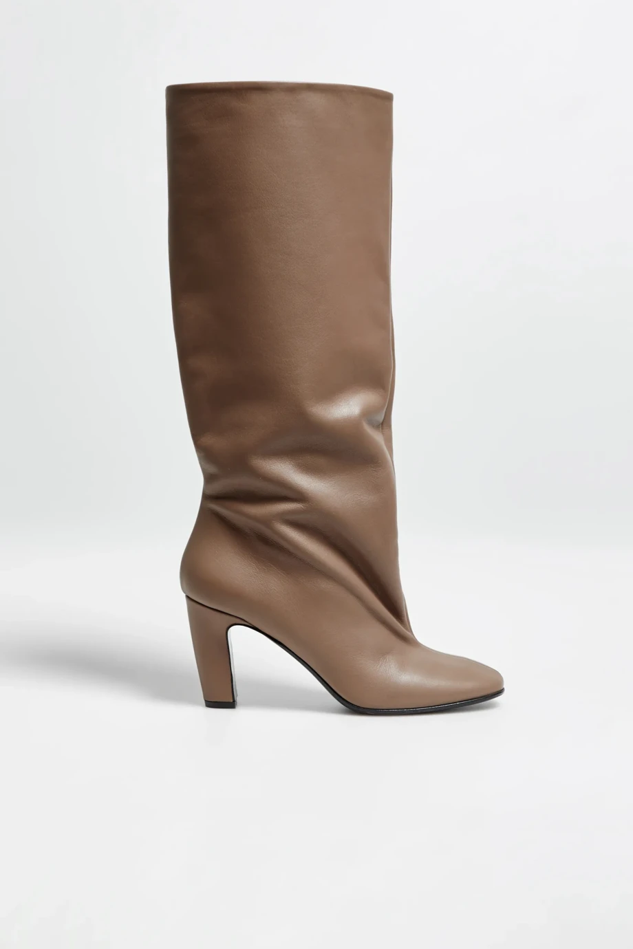 Schlupfstiefel aus braunem, naturbelassenem Glattleder. Runde Spitze, hoher Absatz und breiter Schaft. Minimalistisch. Handgefertigt in einer italienischen Manufaktur.
