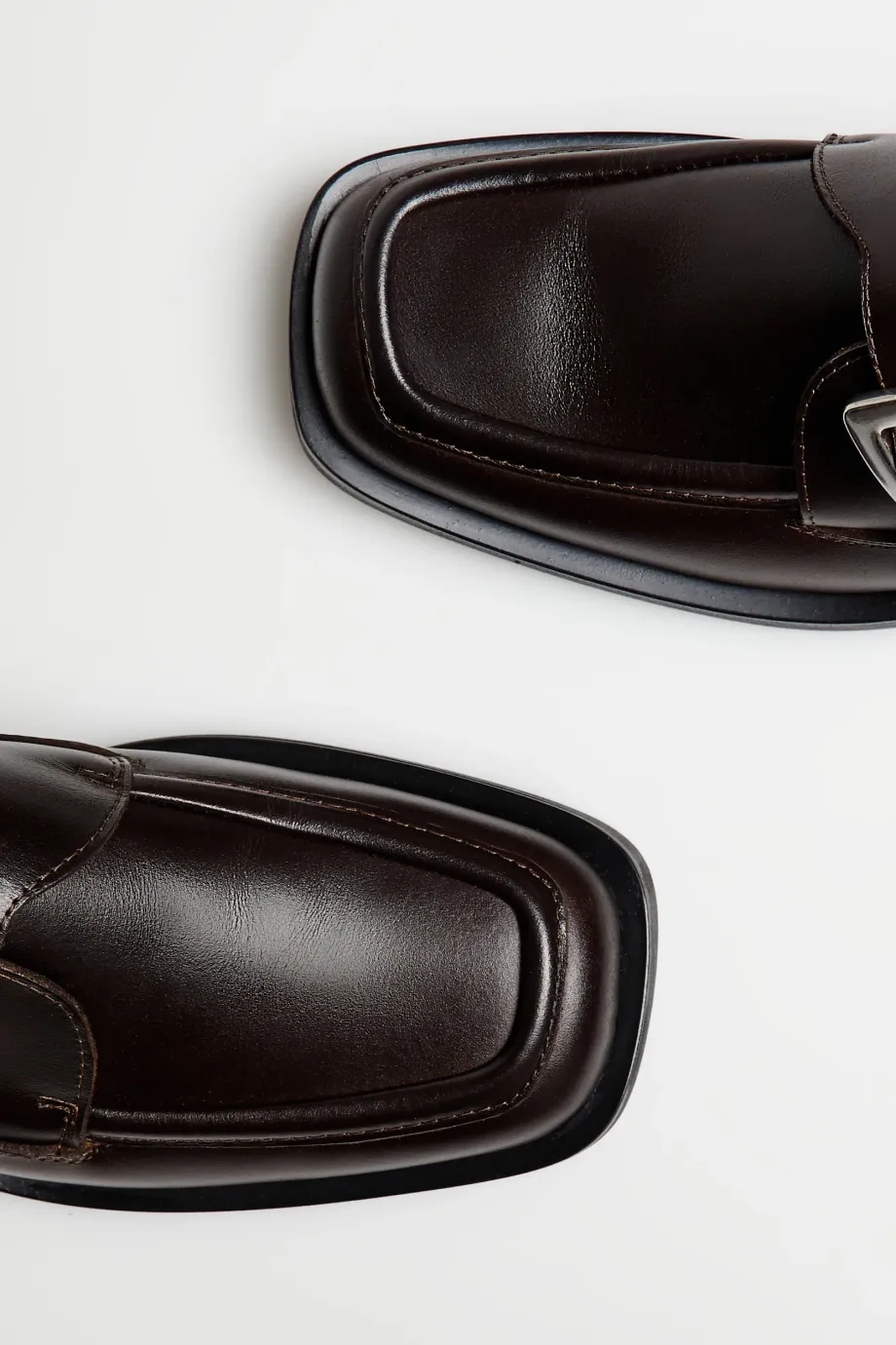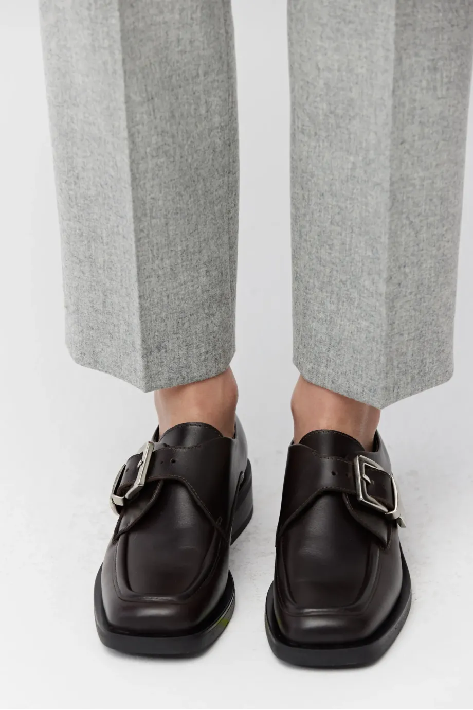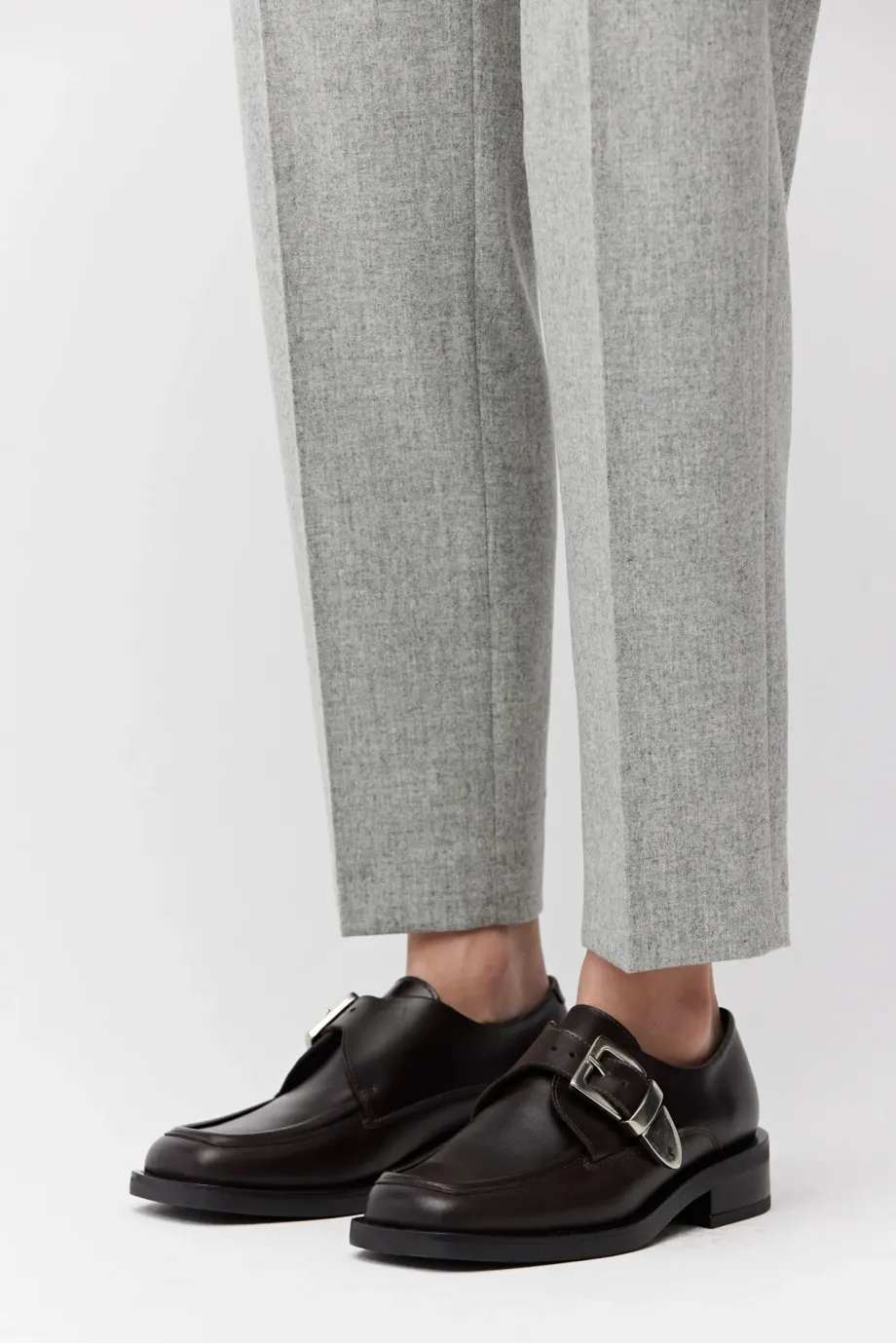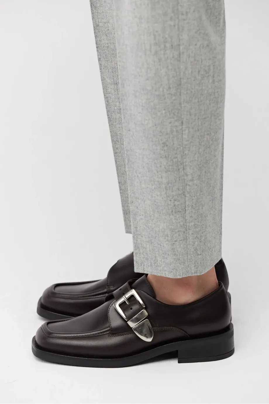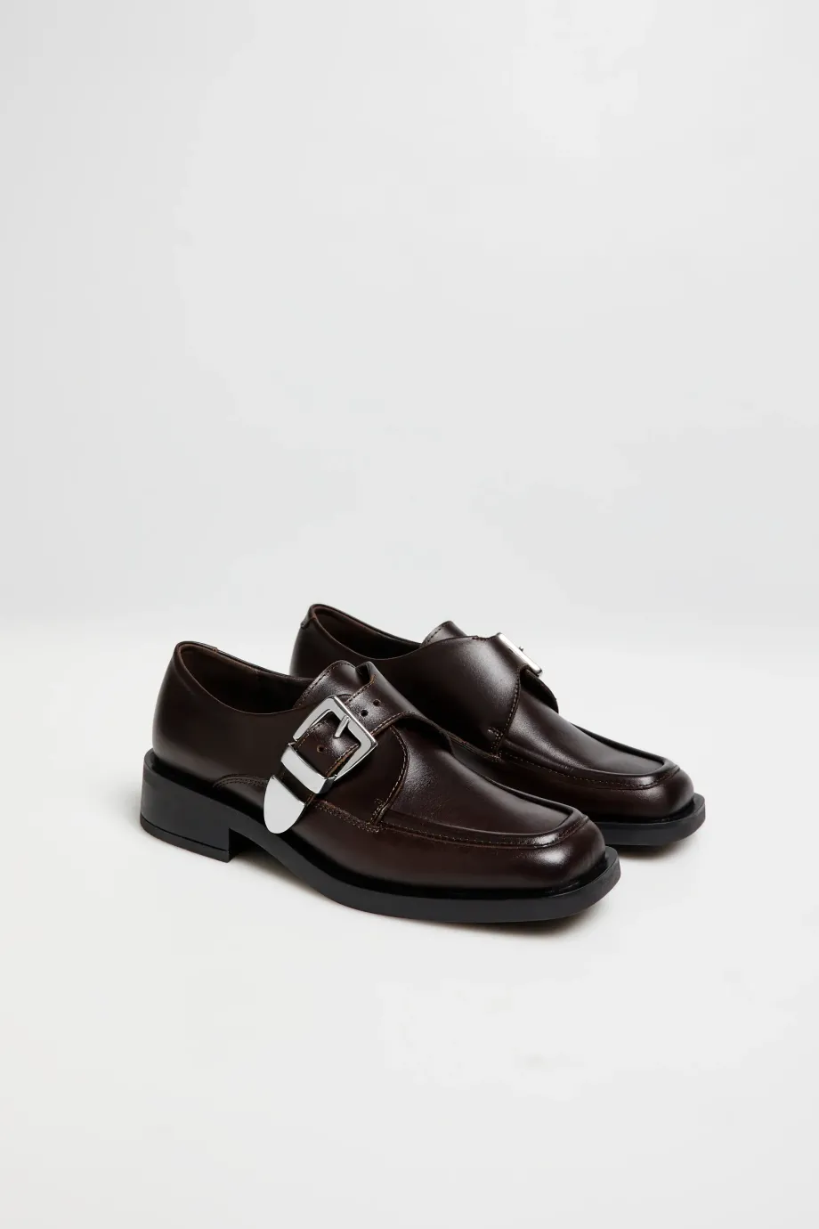 Braune Halbschuhe im Monk-Stil aus echtem Leder, mit Schnalle verschließbar. Quadratische Kappe. Handgefertigt in einer portugiesischen Manufaktur.