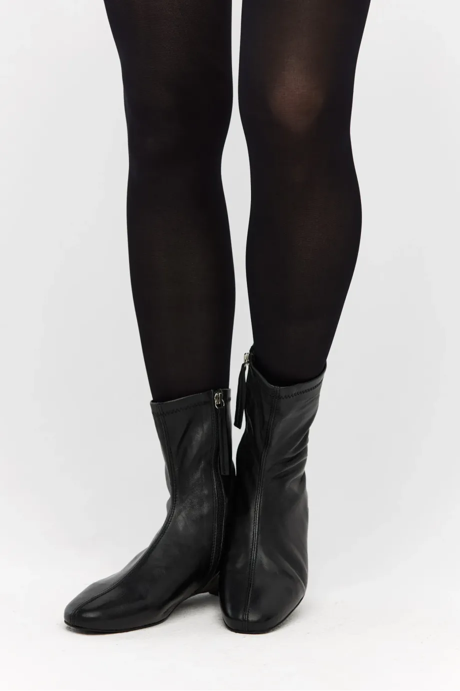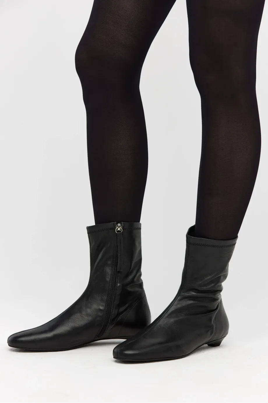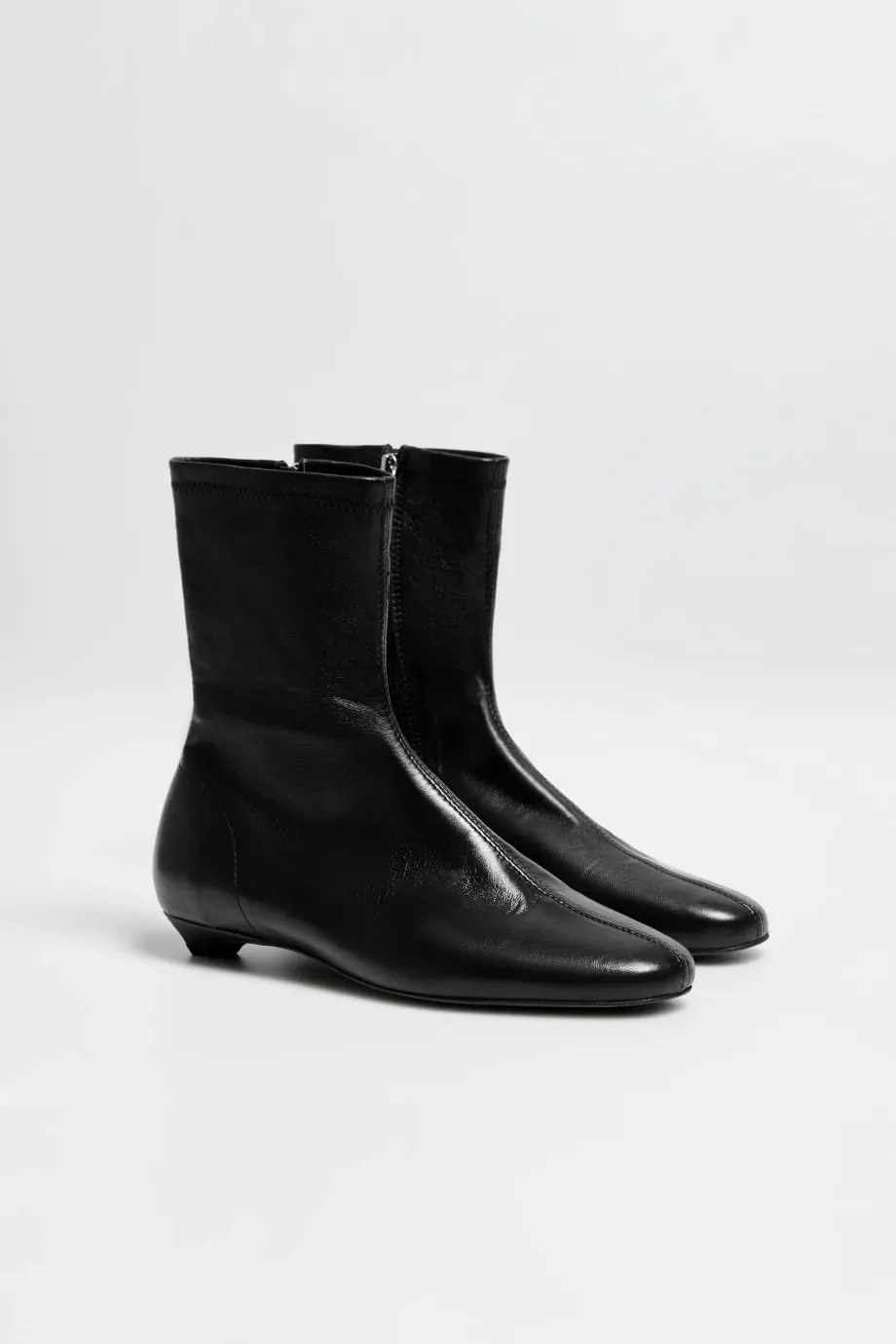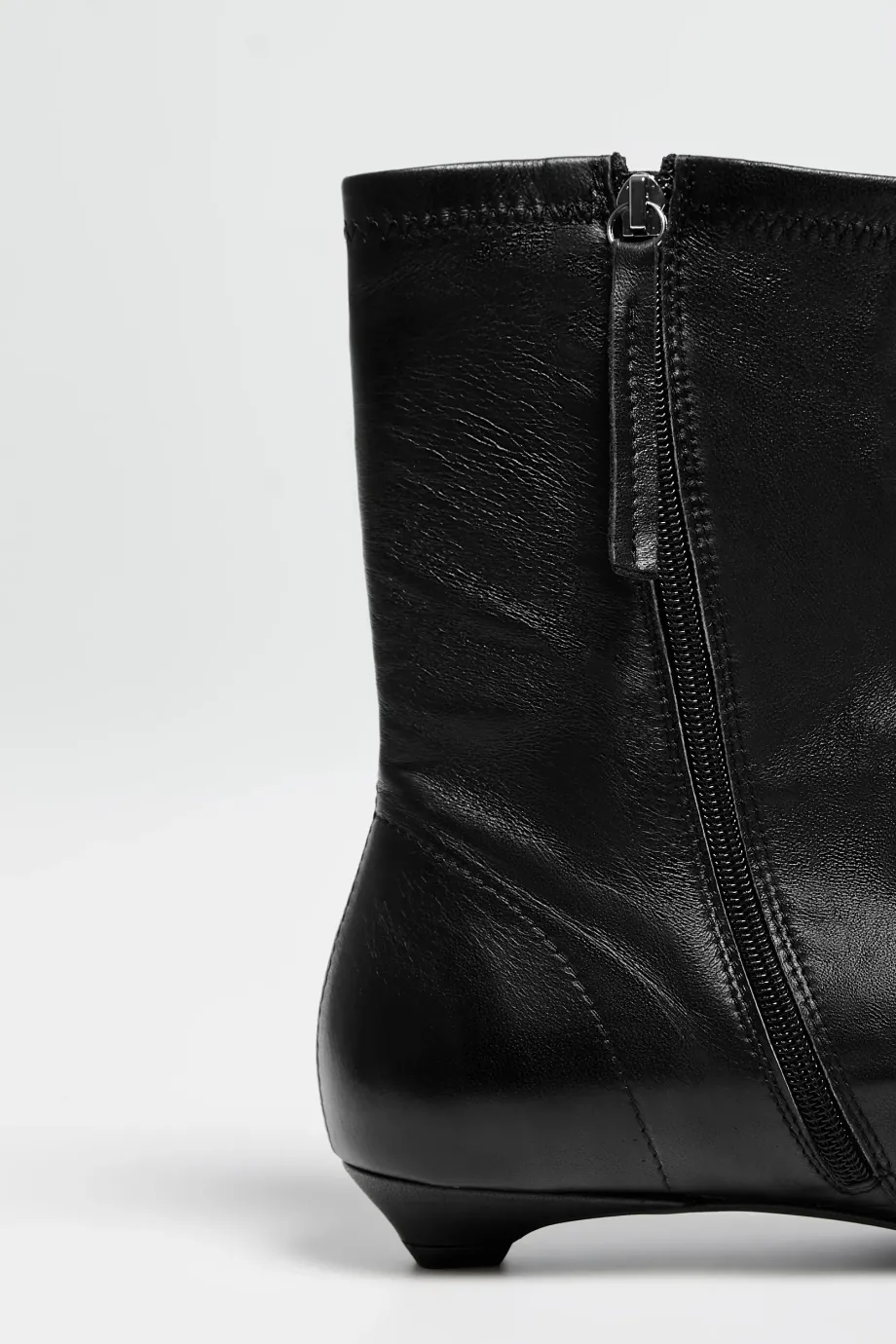 Schwarze Stiefeletten aus sehr weichem, naturbelassenem Leder, handgefertigt in einer polnischen Manufaktur. Klassisches Modell mit geradem Schaft und runder Spitze, Reißverschluss, auf niedrigem Kitten-Heel-Absatz. Minimalistisches Design.