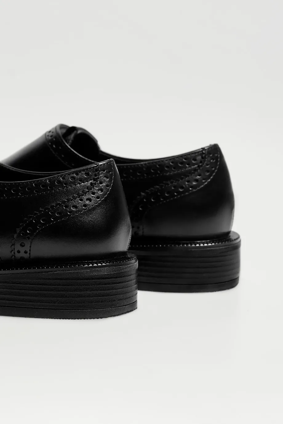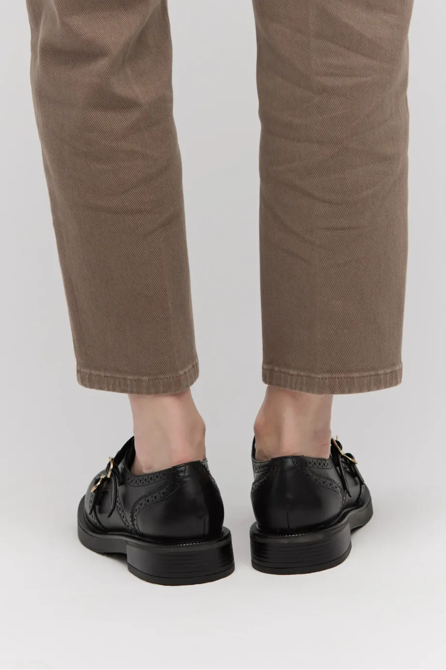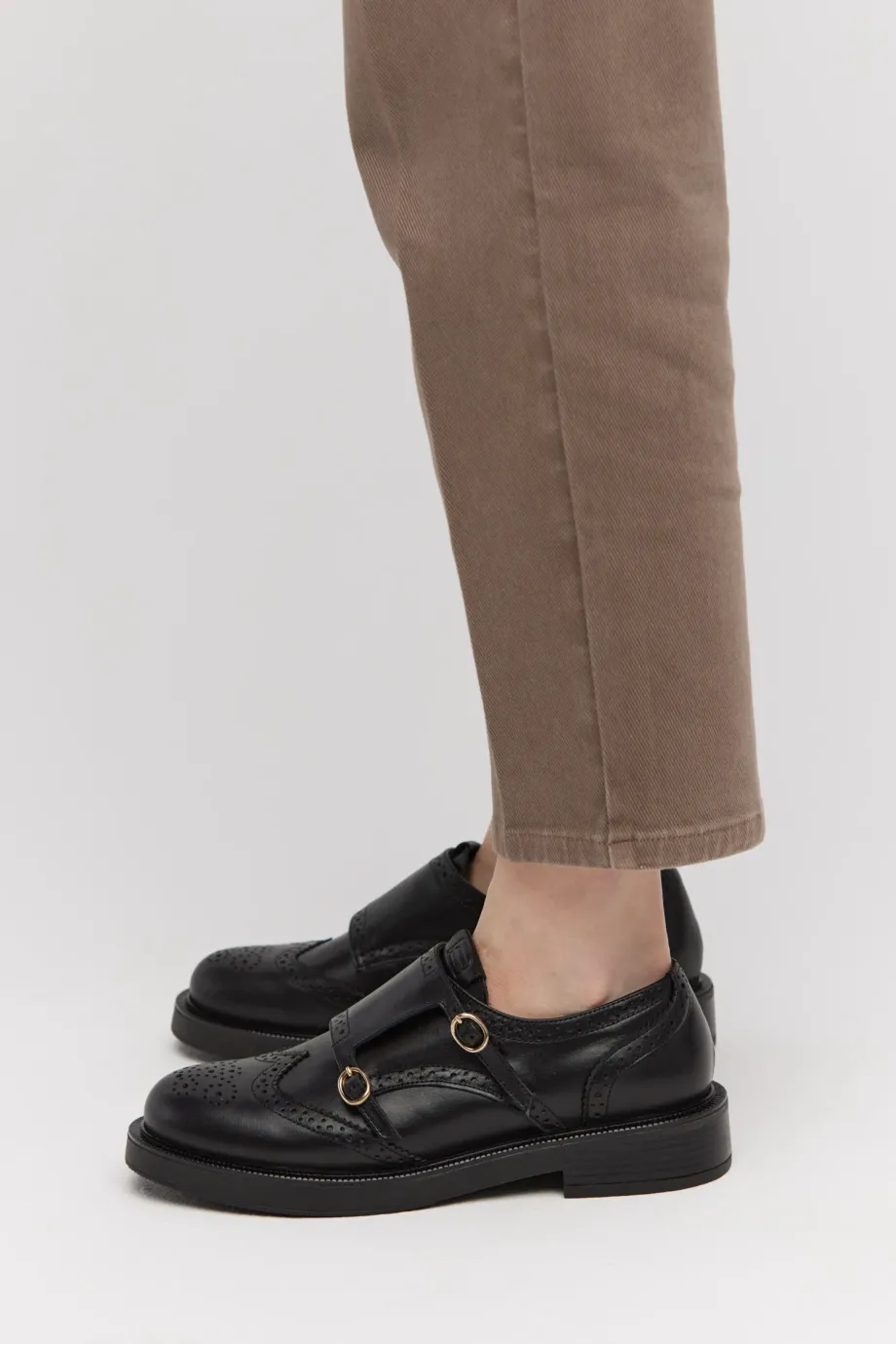 Schwarze Monks aus Naturleder, mit Broguing und doppelten Schnallenverschlüssen. Handgenäht in einer polnischen Manufaktur.