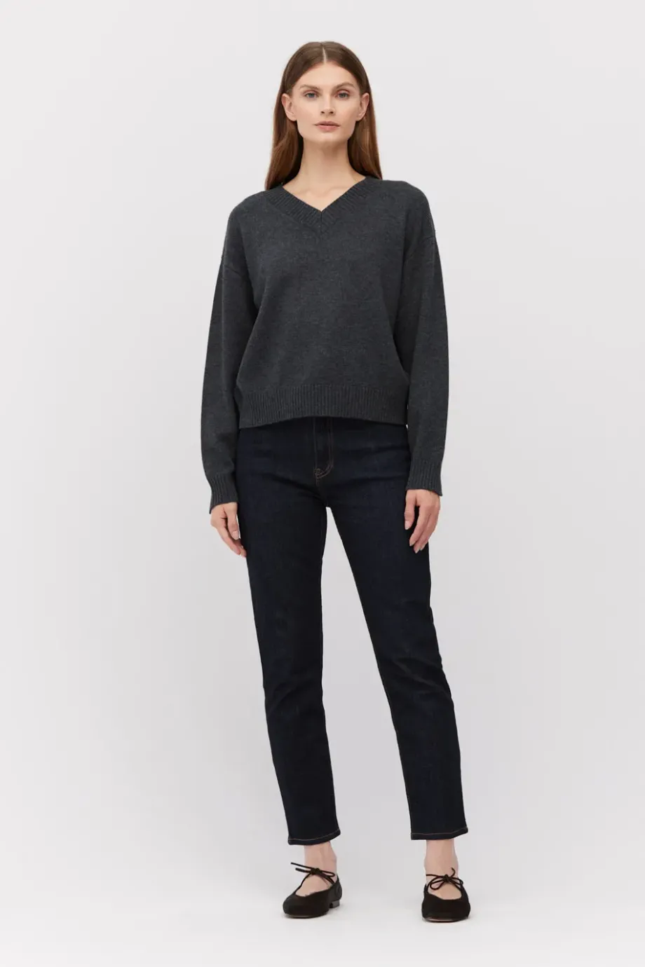 Grauer Pullover aus Kaschmir und Merinowolle, mit lockerem Schnitt und V-Ausschnitt. Gefertigt im Cable Knit-Strickmuster auf einer 7 GG-Maschine. Lange Ärmel, in zwei Farben erhältlich.