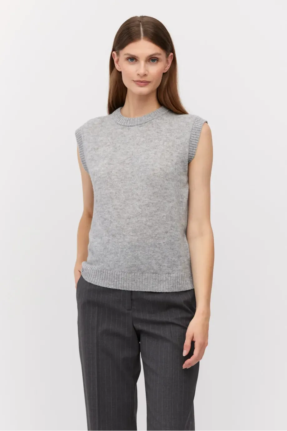Grauer Pullover aus Merinowolle und Kaschmir, mit geradem Schnitt und lockerem Stil. Kurzer Ärmel, runder Ausschnitt, Single-Jersey-Strick mit einer Maschinendichte von 7 GG.