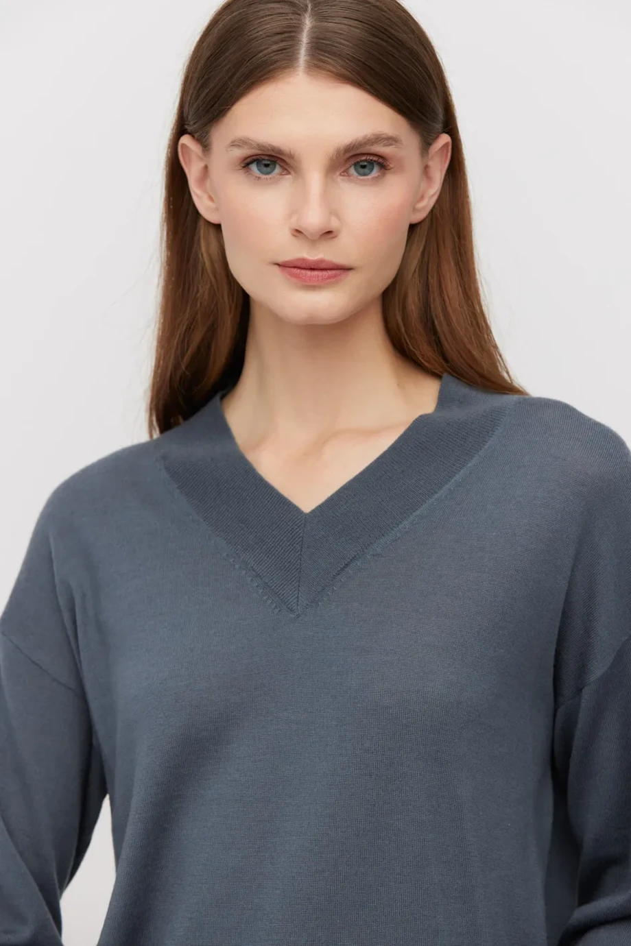 Bluse aus Merinowolle in dunkelgrauer Farbe. V-Ausschnitt, feiner Single-Jersey-Strick, hergestellt an einer 16 GG Maschine. Lange Ärmel.