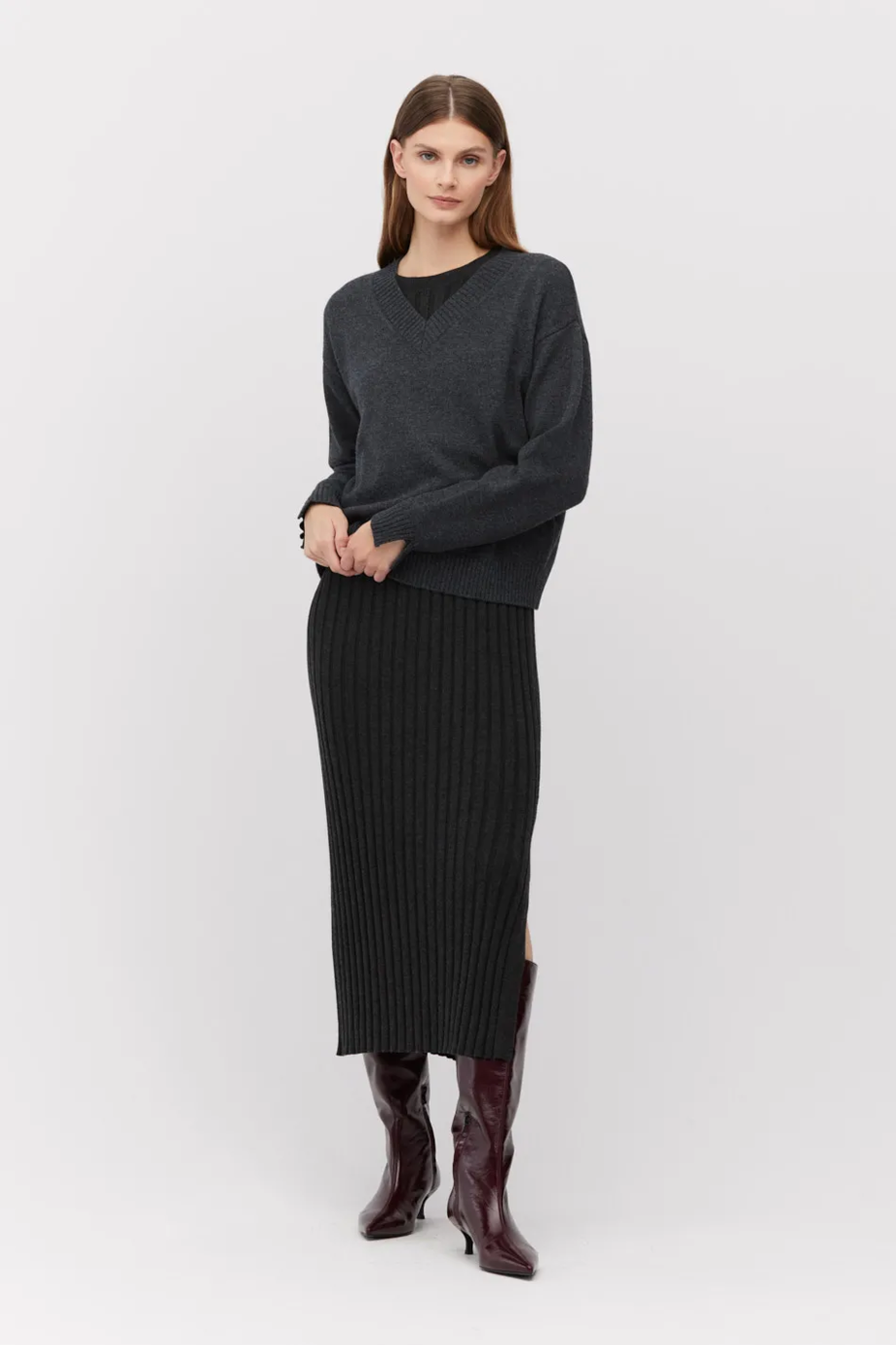 Dunkelgraues, eng anliegendes Strickkleid mit Merinowollanteil, vertikaler Rippenstrick - 12 GG Rippenstrick. Lange Ärmel, Rundhalsausschnitt und Seitenschlitz. Midi-Länge.