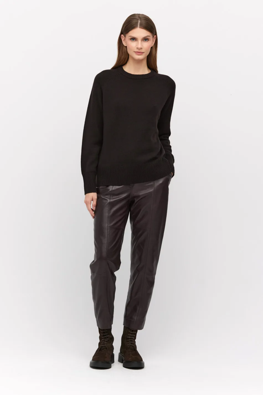 Hose aus echtem Leder in Auberginenfarbe, mit Futter. Verschluss mit Reißverschluss und Haken, innen ein Knopf aus natürlicher Walnuss. Taschen.