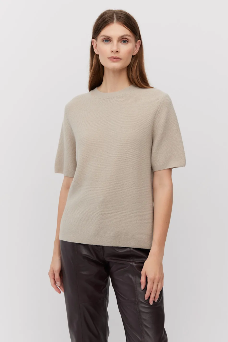 Bluse aus Merinowolle und Kaschmir in kühlem Beigeton. Schlichte Form mit rundem Ausschnitt und kurzem Ärmel. Gestrickt im Half-Milano-Rippenstich auf einer Maschine mit 14 GG.