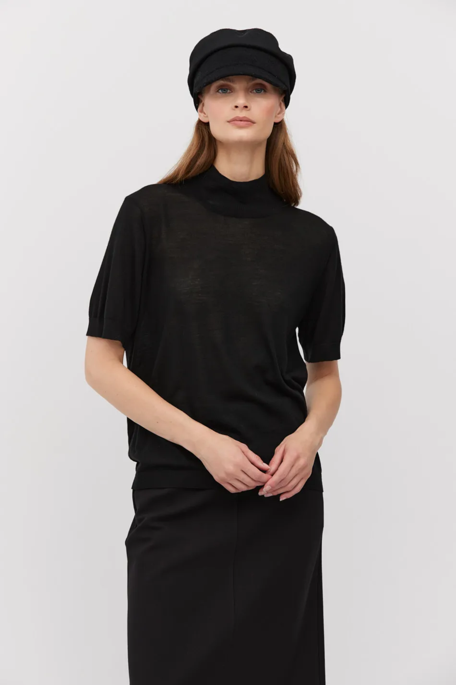Halbrollkragenpullover aus Merinowolle. Schlichte Form mit kurzem Ärmel. Feines Maschenbild im Jersey-Strick, gefertigt auf einer Maschine mit 18 GG. Farbe Schwarz.
