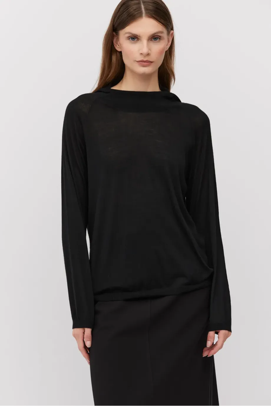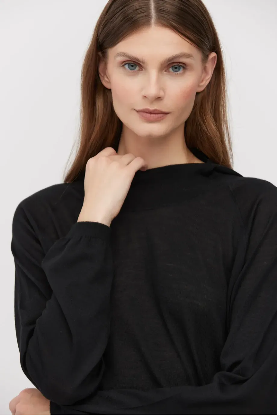 Sweatshirt aus Merinowolle. Schmale, körpernahe Form mit langem Ärmel. Feines Maschenbild, gestrickt auf einer Maschine mit 16 GG. Farbe Schwarz.