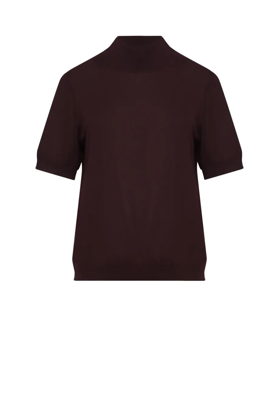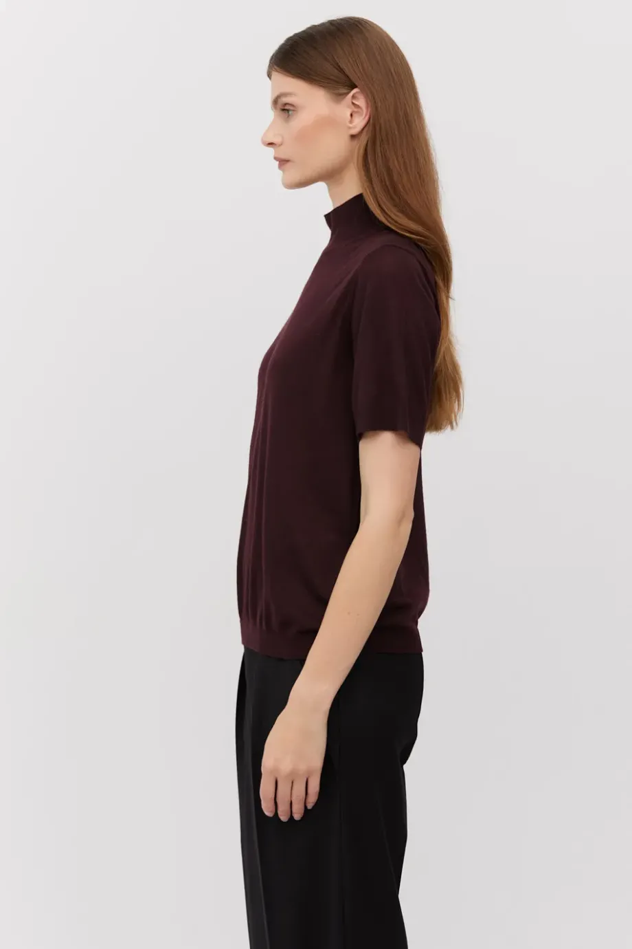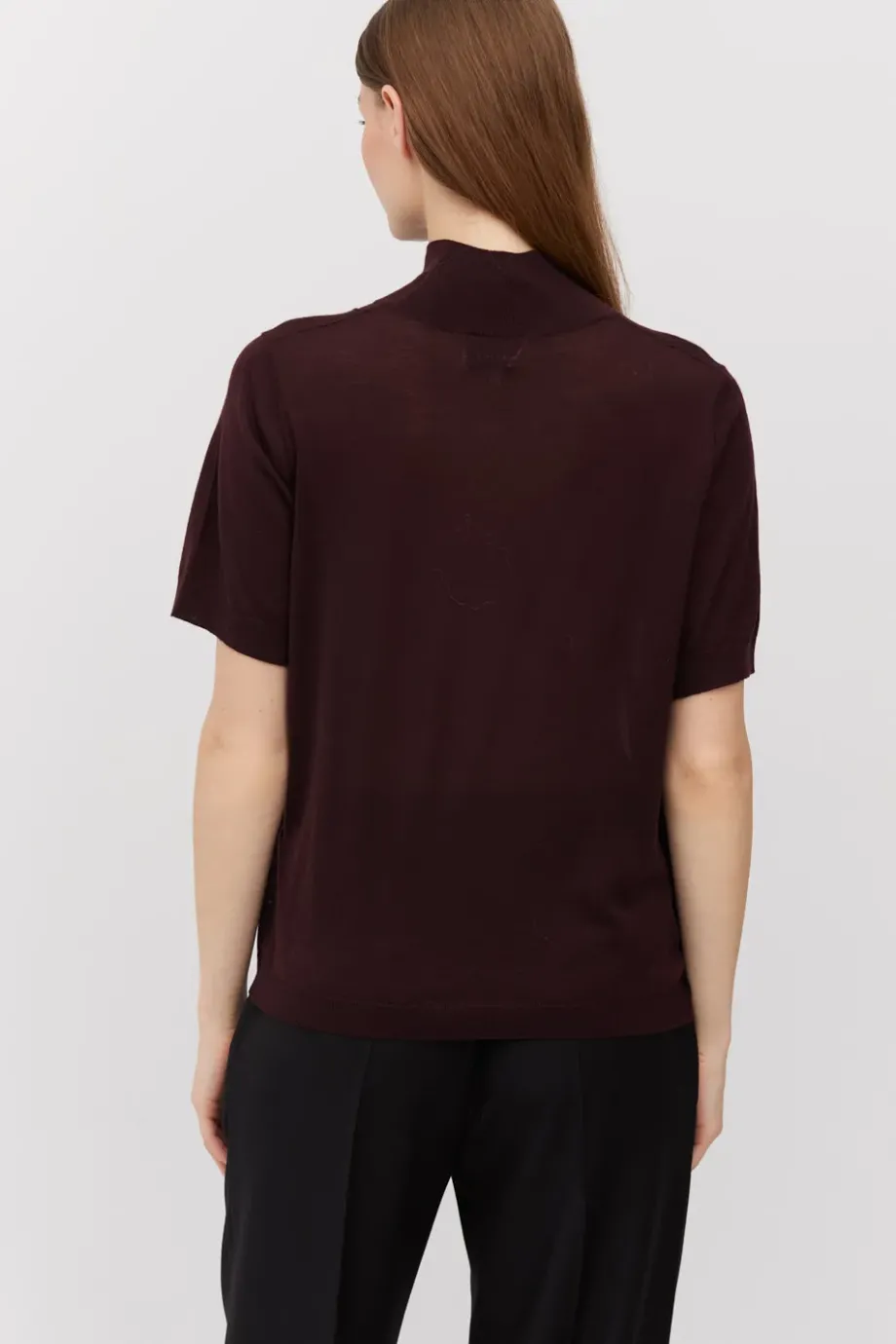 Halbrollkragenpullover aus Merinowolle. Schlichte Form mit kurzem Ärmel. Feines Maschenbild im Jersey-Strick, auf einer Maschine mit 18 GG gefertigt. Farbe Kirschrot.