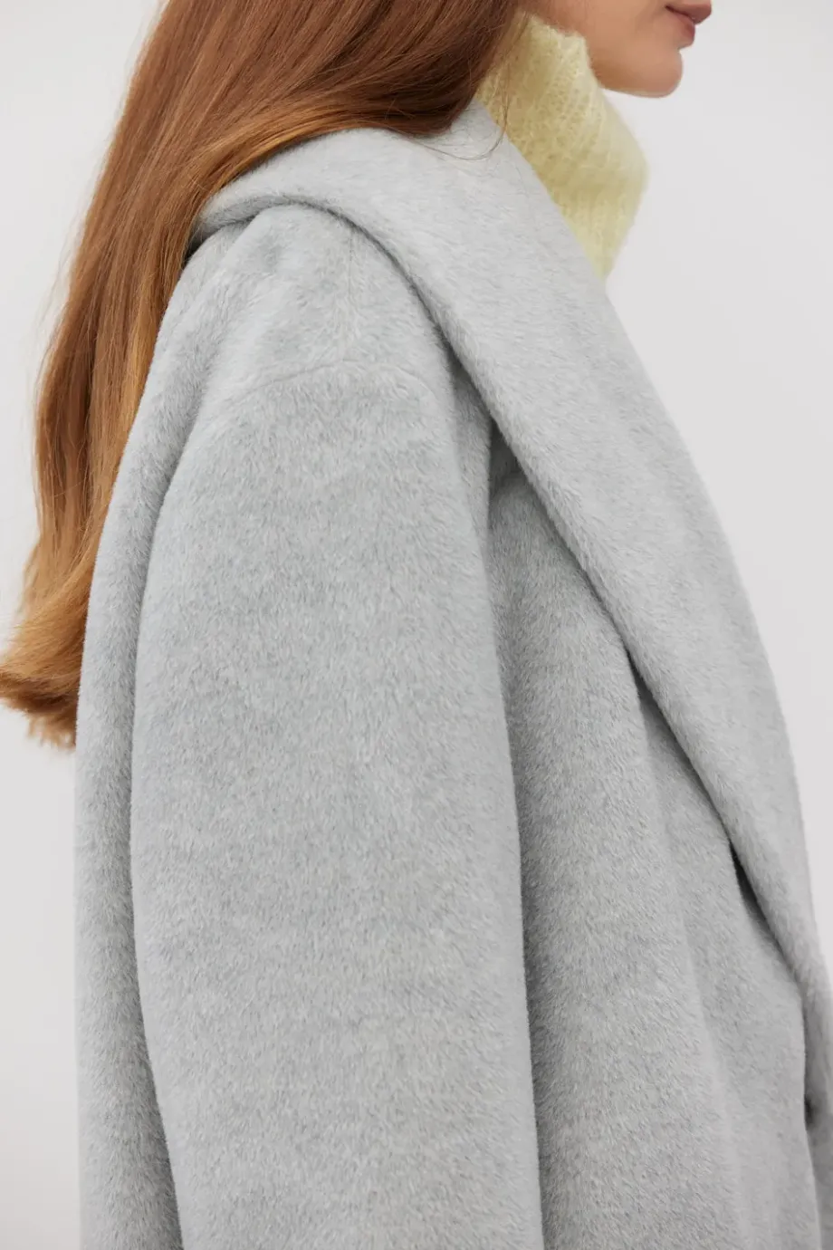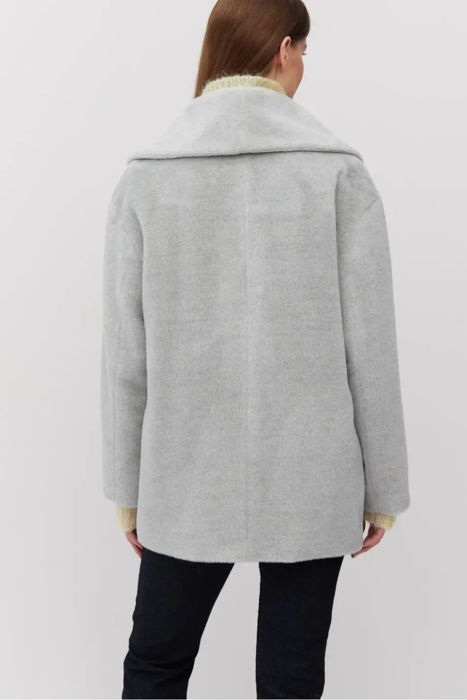 Jacke aus Baby Suri Alpaka in Grau. Lockerer Schnitt mit Schalkragen. Verschluss mit Naturknöpfen. Modell mit Futter und dekorativem Paspel.