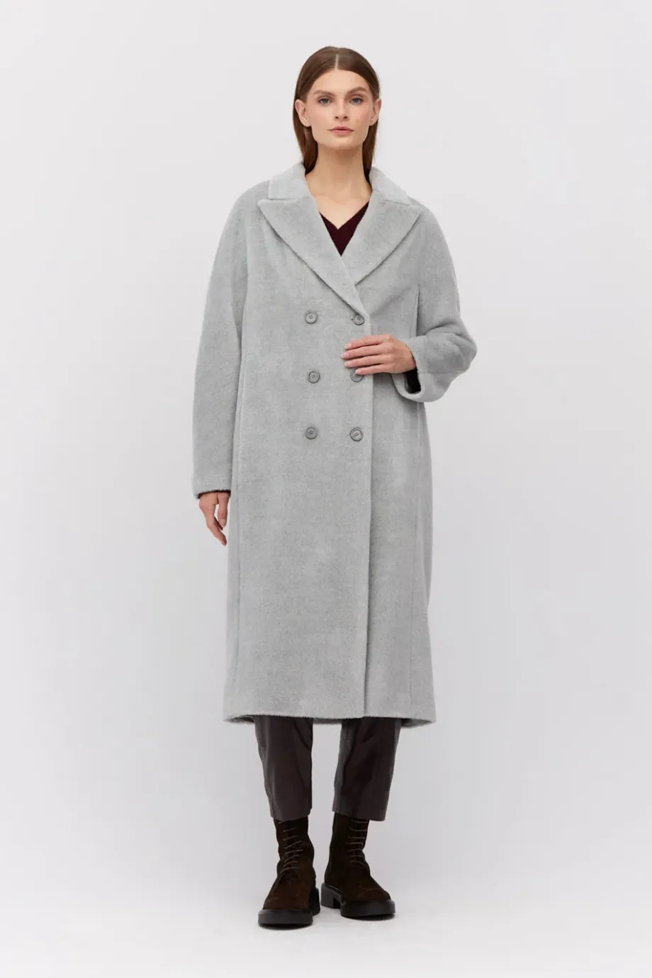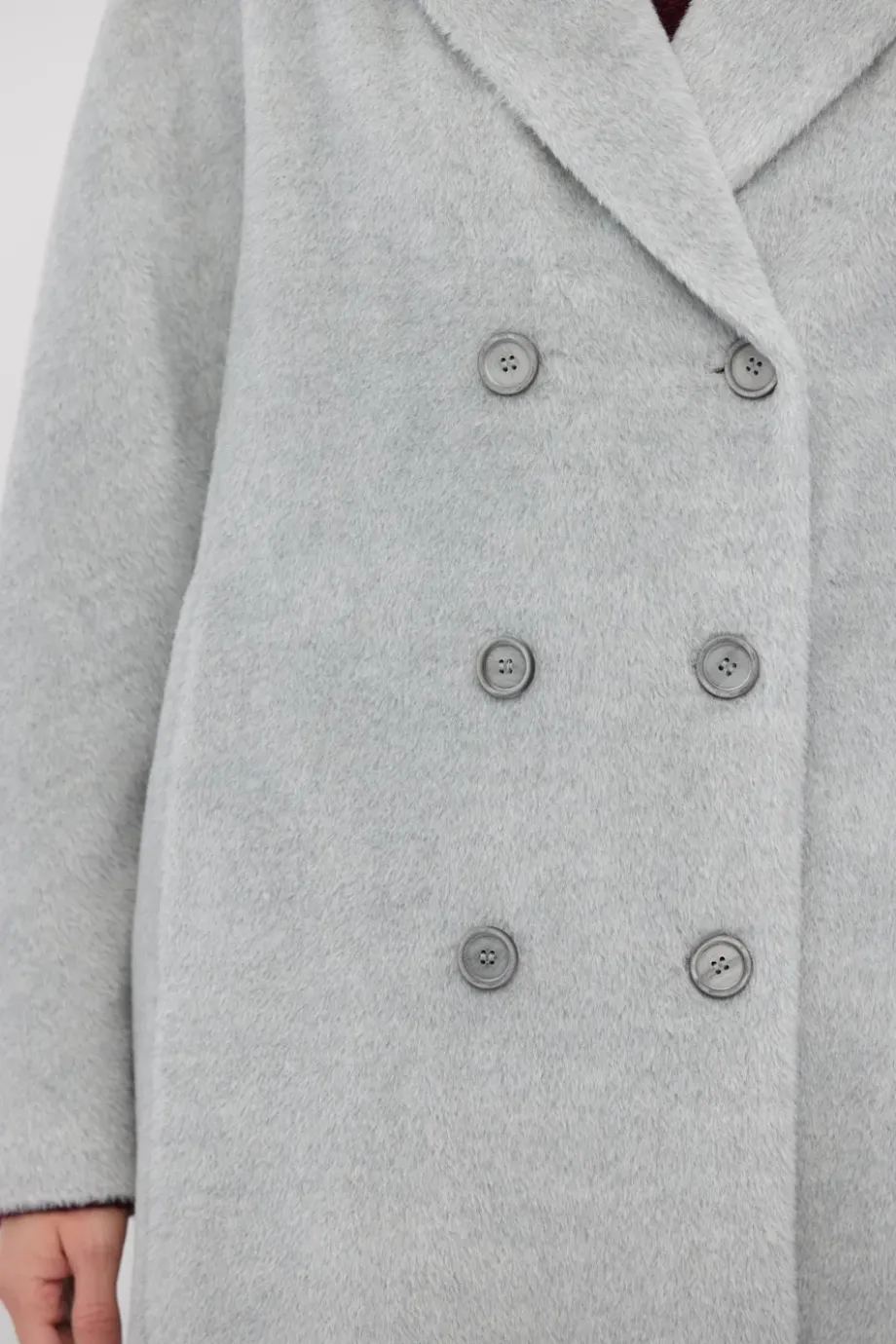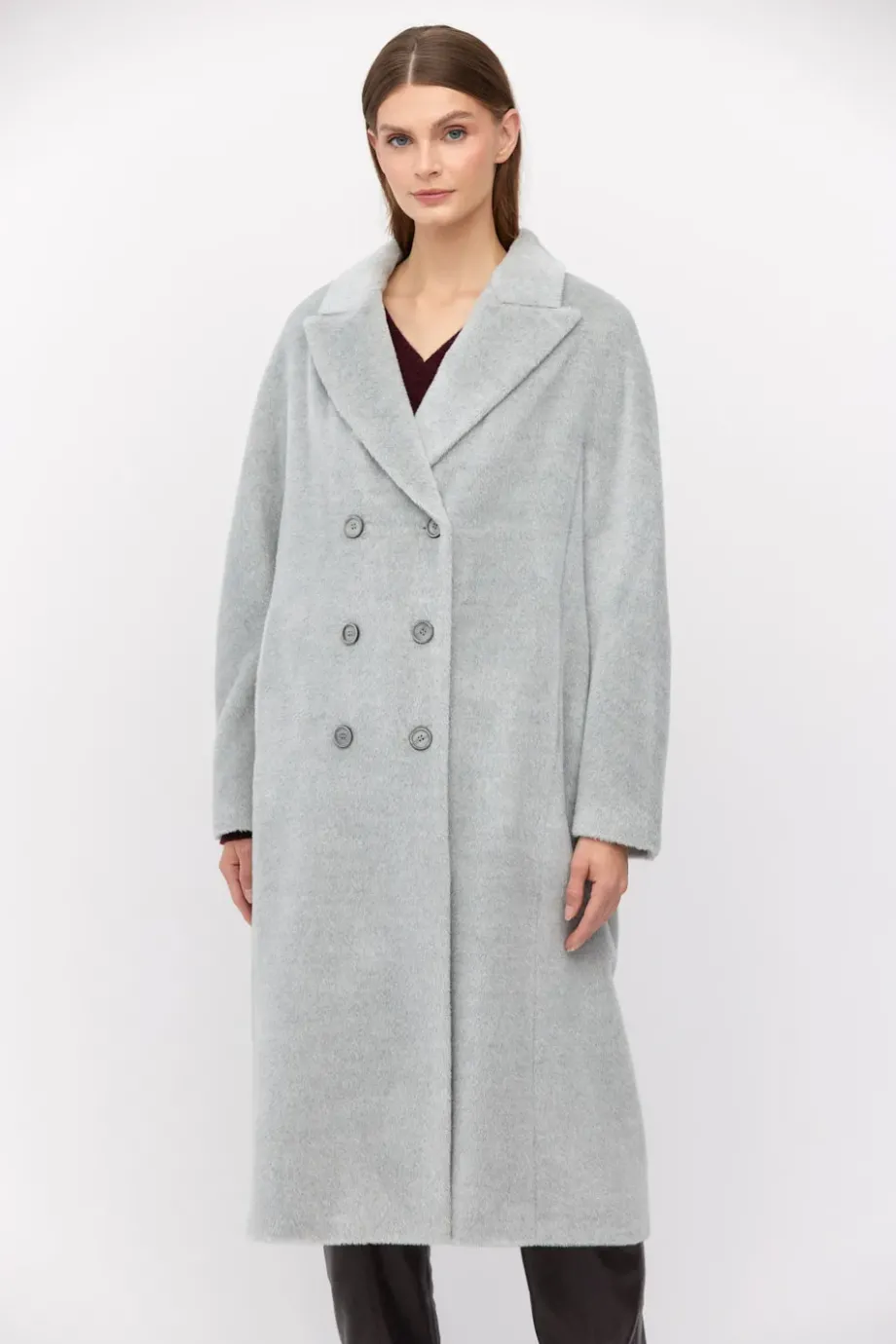 Mantel in Grautönen aus Baby Suri Alpaka. Lockerer, gerader Schnitt, doppelreihiger Verschluss mit Naturknöpfen. Kimonoärmel, hinten mit Schlitz. Modell mit Futter und dekorativem Paspel.