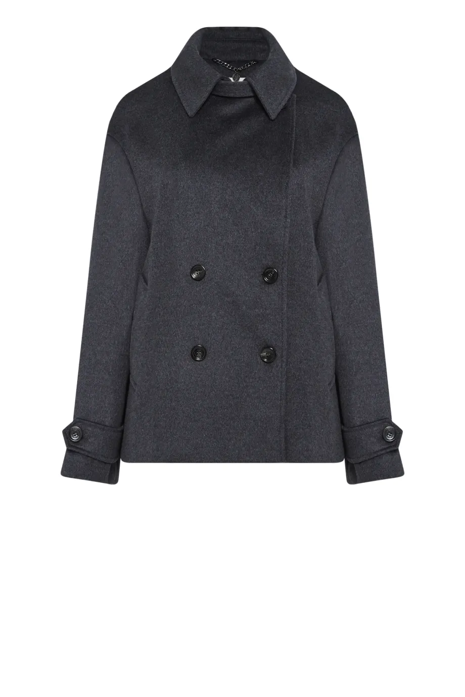 Dunkelgraue Wolljacke mit lockerem Schnitt. Zweireihig, bis zum Hals zu schließen. Modell mit Futter, leicht herabfallenden Schultern, Kellerfalte hinten und Schulterklappen an den Ärmeln.