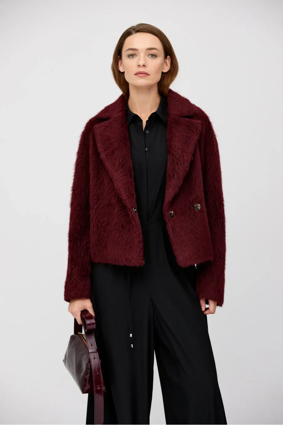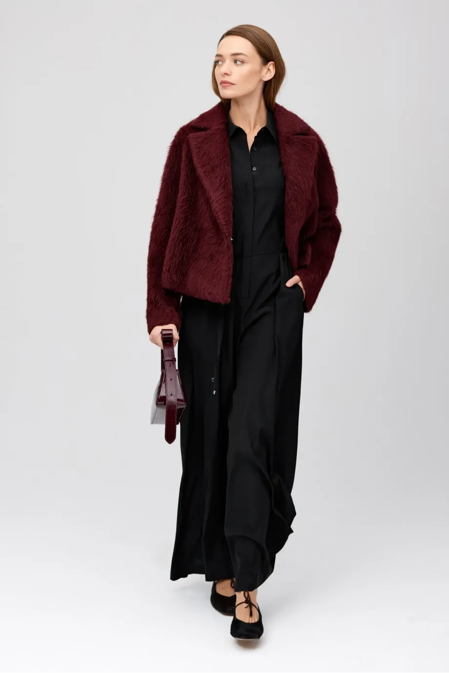 Jacke aus Alpakawolle und Lammwolle (Schurwolle). Lockerer Schnitt mit Kragen. Lange Ärmel. Druckknopfverschluss. Modell mit Futter und dekorativer Paspelierung. Farbe Kirschrot.