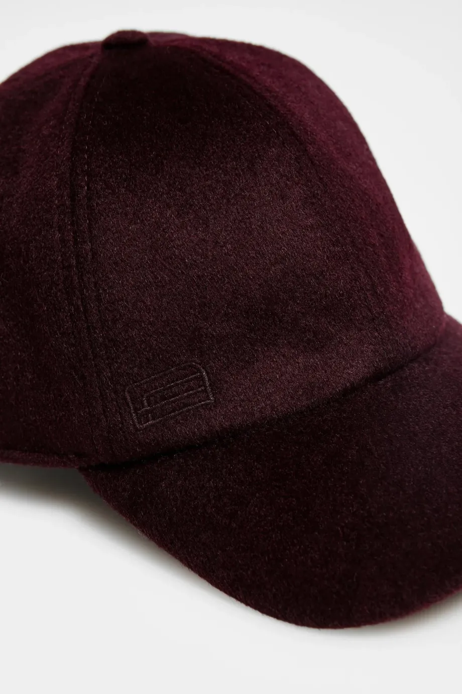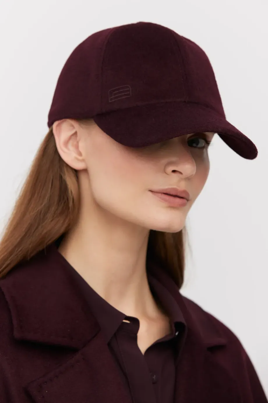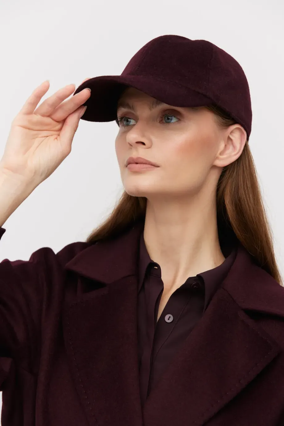 Cap in der Farbe Aubergine. Hergestellt aus Wolle mit Kaschmir- und Seidenanteil. Verstellbarer Verschluss hinten.