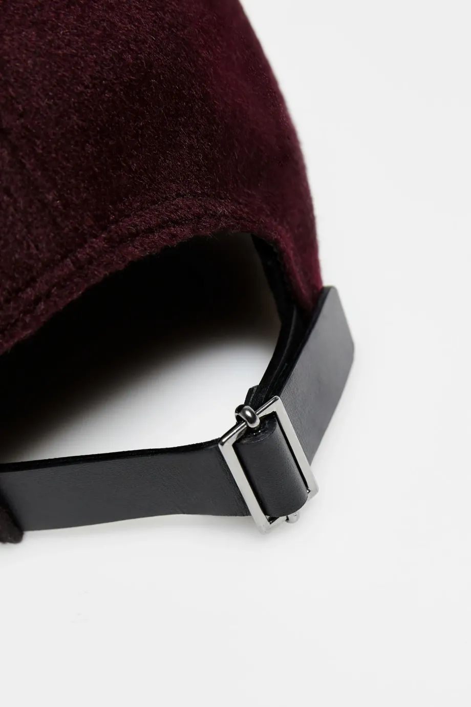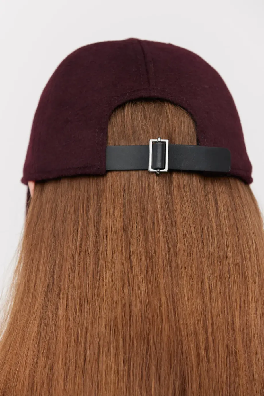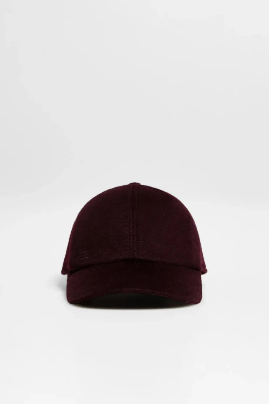 Cap in der Farbe Aubergine. Hergestellt aus Wolle mit Kaschmir- und Seidenanteil. Verstellbarer Verschluss hinten.