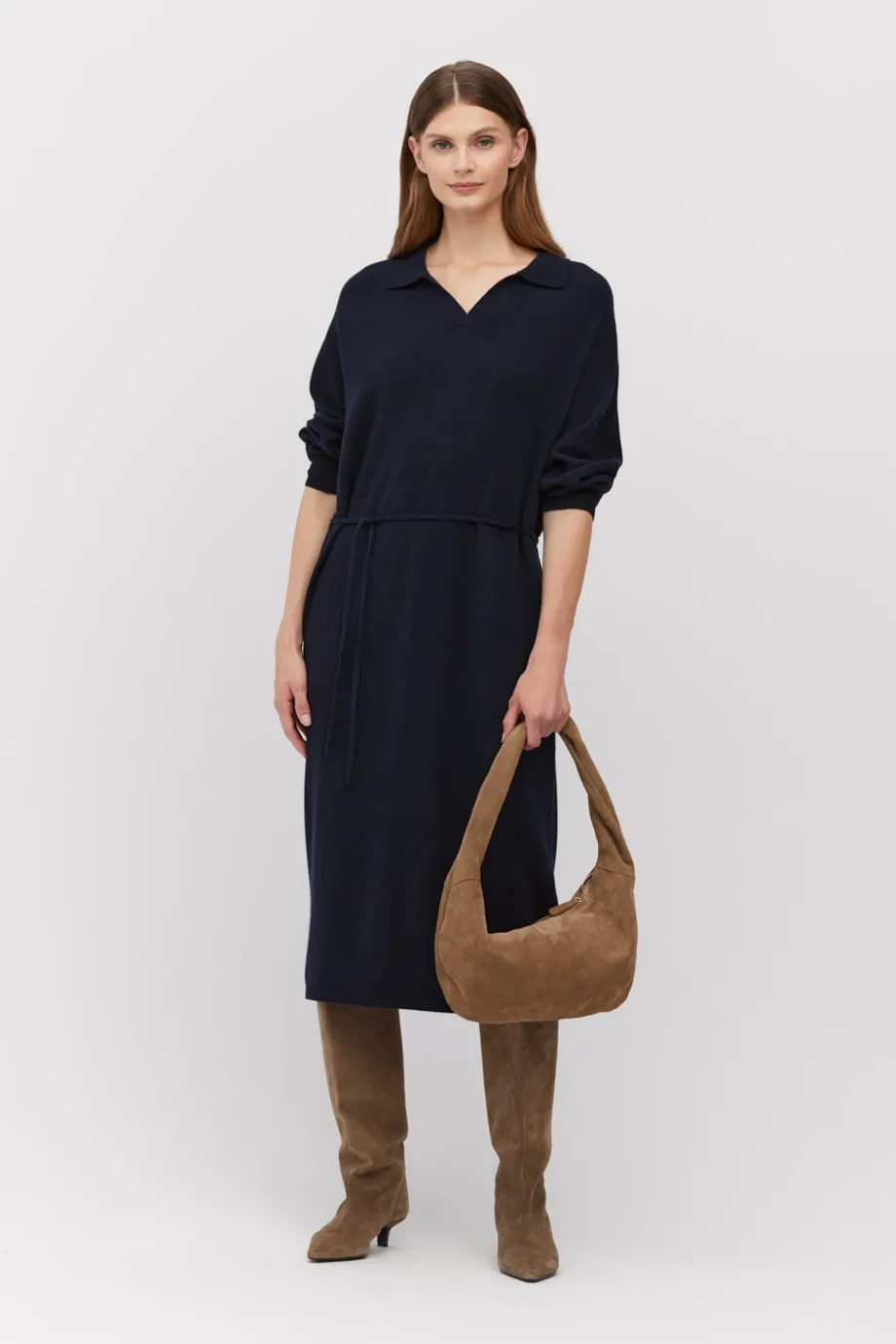 Dunkelblaues Midikleid aus Merinowolle und Kaschmir. Schlichte, lockere Form mit Polokragen, langen Ärmeln und einem Gürtel zur Betonung der Taille. Gestrickt im Jersey-Stich auf einer Maschine mit 12 GG.