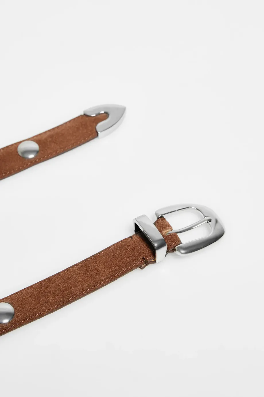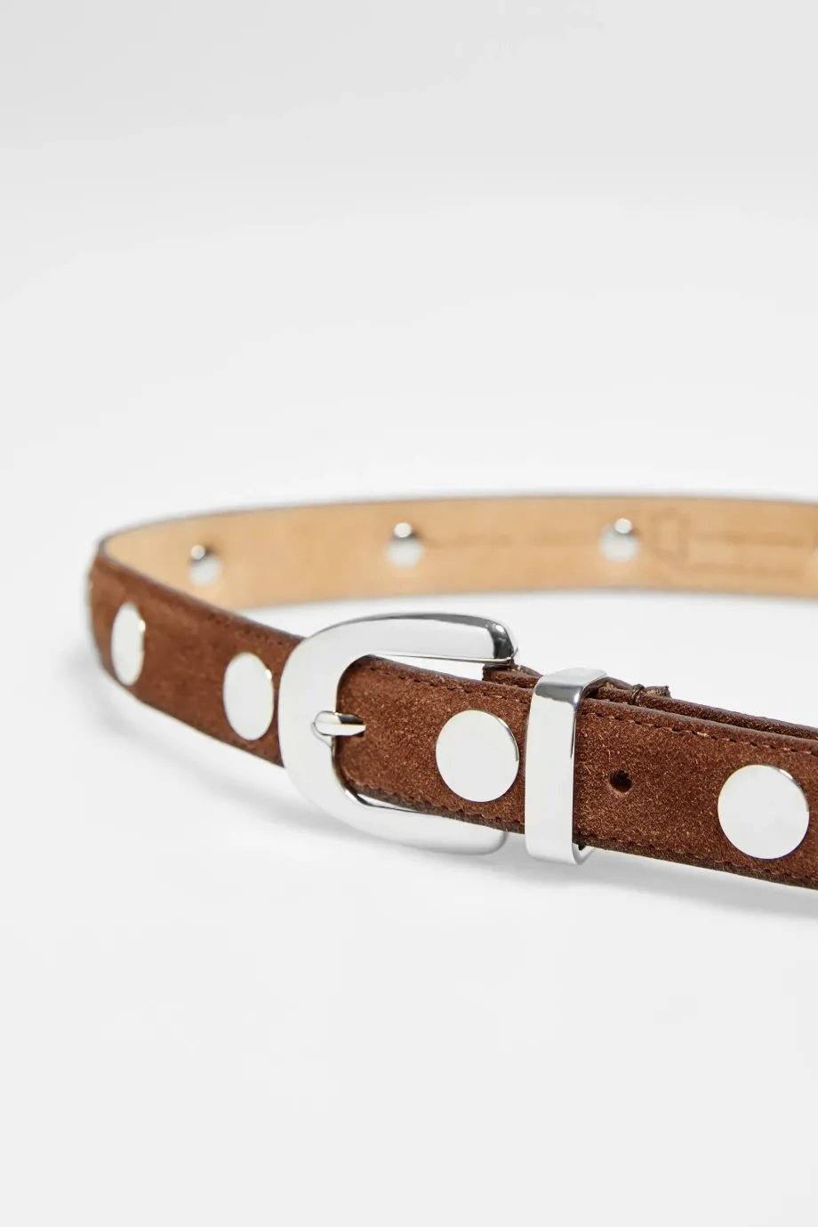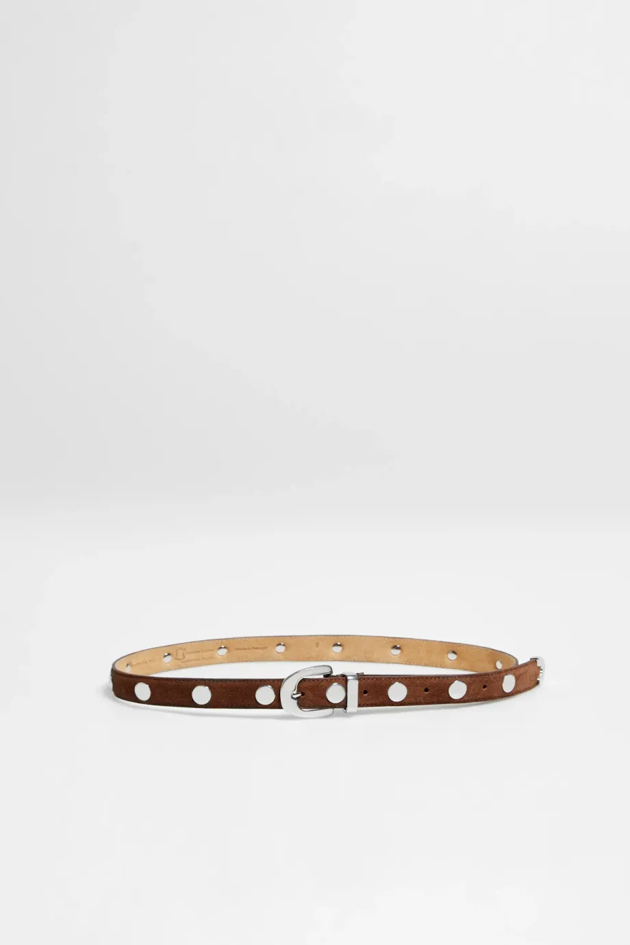 Brauner Gürtel aus Veloursleder. Verschluss mit Metallschnalle. Mit dekorativen Nieten. Handgefertigt in einer portugiesischen Manufaktur.