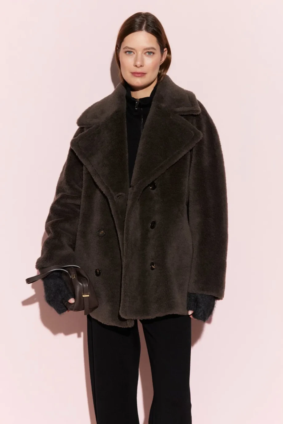 Jacke aus Teddybärwolle. Lockerer, zweireihiger Schnitt. Kragen, Taschen, lange Ärmel. Außenknöpfe aus Naturhorn, Innenknöpfe aus Corozo-Nuss. Farbe: Dunkelbraun.